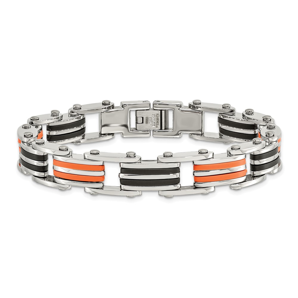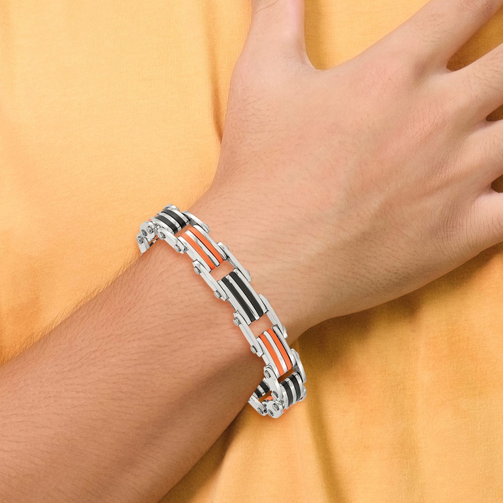 Stainless Steel 8.5-inch Polished with Rubber Black and Orange Bracelet