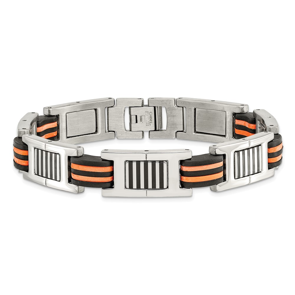 Stainless Steel 8.5-inch Polished with Rubber Black and Orange Bracelet