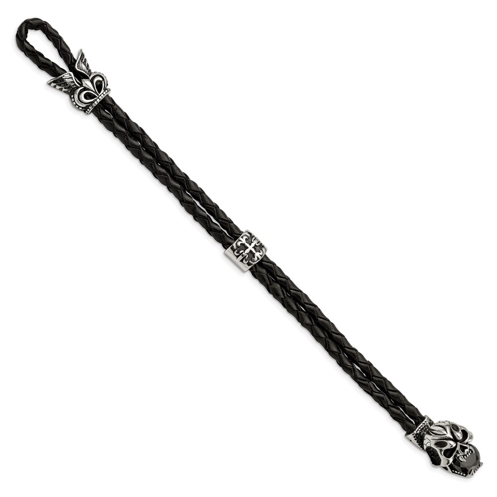 Finish:Polished & Antiqued Length of Item:8.5-inch Material: Accents:Leather Material: Accent Color 1:Black Chain Length:8.5-inch Chain Type:Leather Clasp /Connector:Toggle Material: Primary:Stainless Steel Width of Item:10 mm Packaging:Gift Pouch Product Type:Jewelry Jewelry Type:Bracelets Sold By Unit:Each Bracelet Type:Men’s Gender:Men’s Material: Primary – Color:White Items per Pack:1
