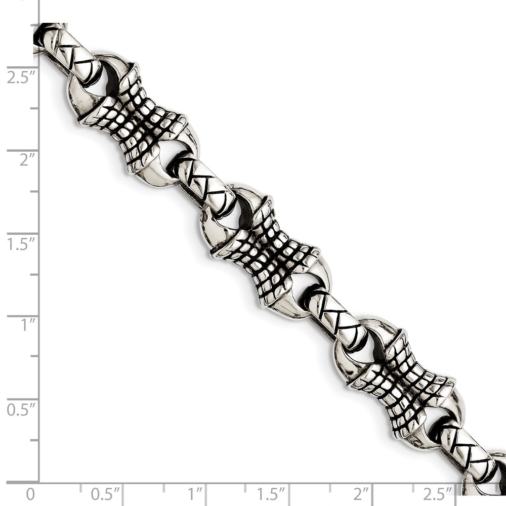 Finish:Polished & Antiqued Length of Item:8.75-inch Chain Length:8.75-inch Chain Type:Fancy Chain Width:13 mm Clasp /Connector:Lobster (Fancy) Material: Primary:Stainless Steel Width of Item:13 mm Packaging:Gift Pouch Product Type:Jewelry Jewelry Type:Bracelets Sold By Unit:Each Bracelet Type:Contemporary Gender:Men’s Texture:Textured Material: Primary – Color:White Items per Pack:1