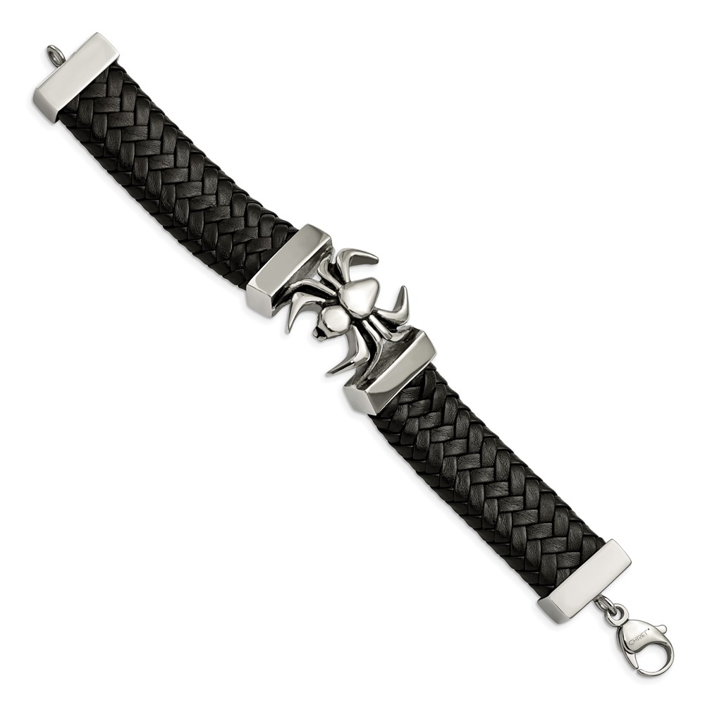 Stainless Steel Antiqued and Polished Spider Black Leather 8.5-inch Bracelet