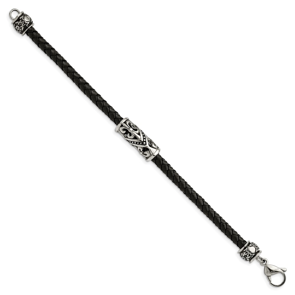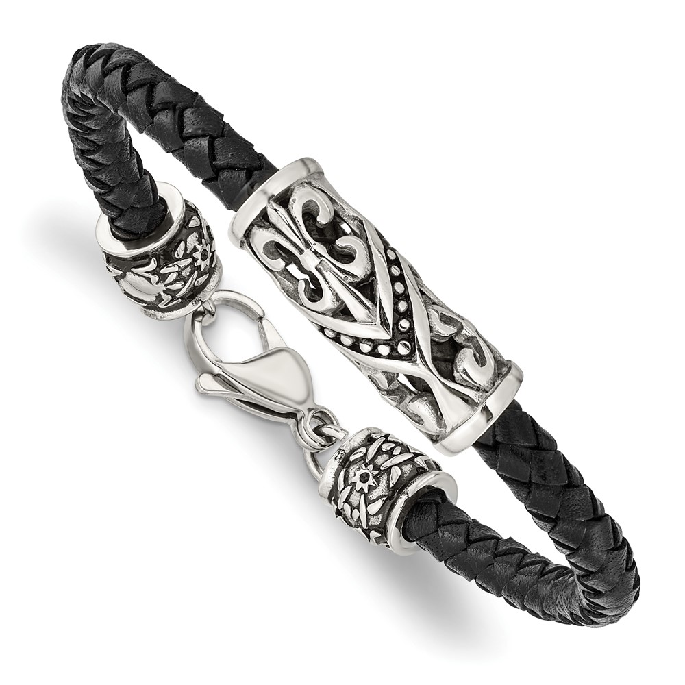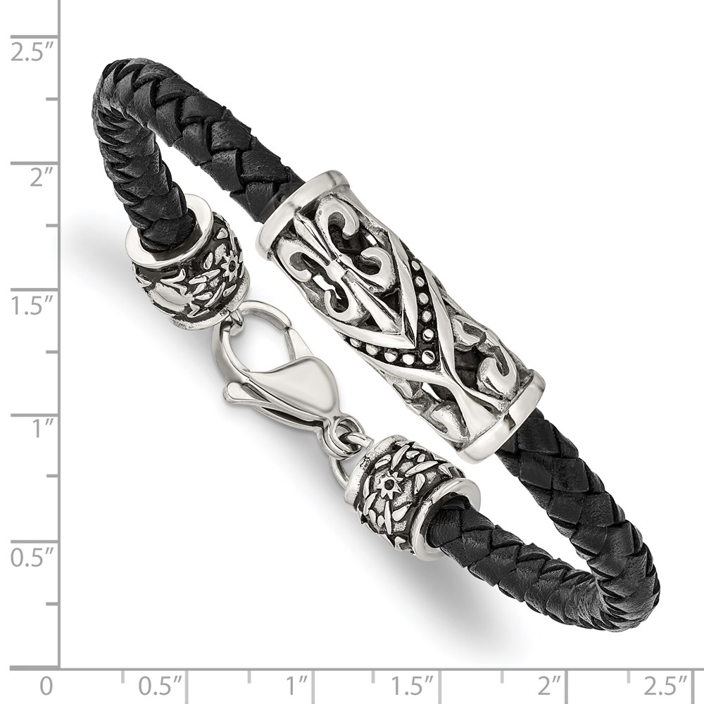 Stainless Steel Antiqued & Polished Fleur De Lis Black Leather Bracelet