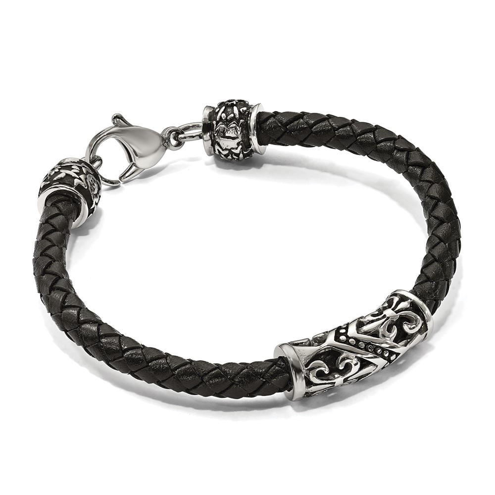 Finish:Polished & Antiqued Length of Item:8.5-inch Material: Accents:Leather Material: Accent Color 1:Black Chain Length:8.5-inch Chain Type:Leather Clasp /Connector:Lobster (Fancy) Material: Primary:Stainless Steel Width of Item:6.5 mm Packaging:Gift Pouch Product Type:Jewelry Jewelry Type:Bracelets Sold By Unit:Each Bracelet Type:Cord, Leather & Rubber Gender:Men’s Material: Primary – Color:White Items per Pack:1