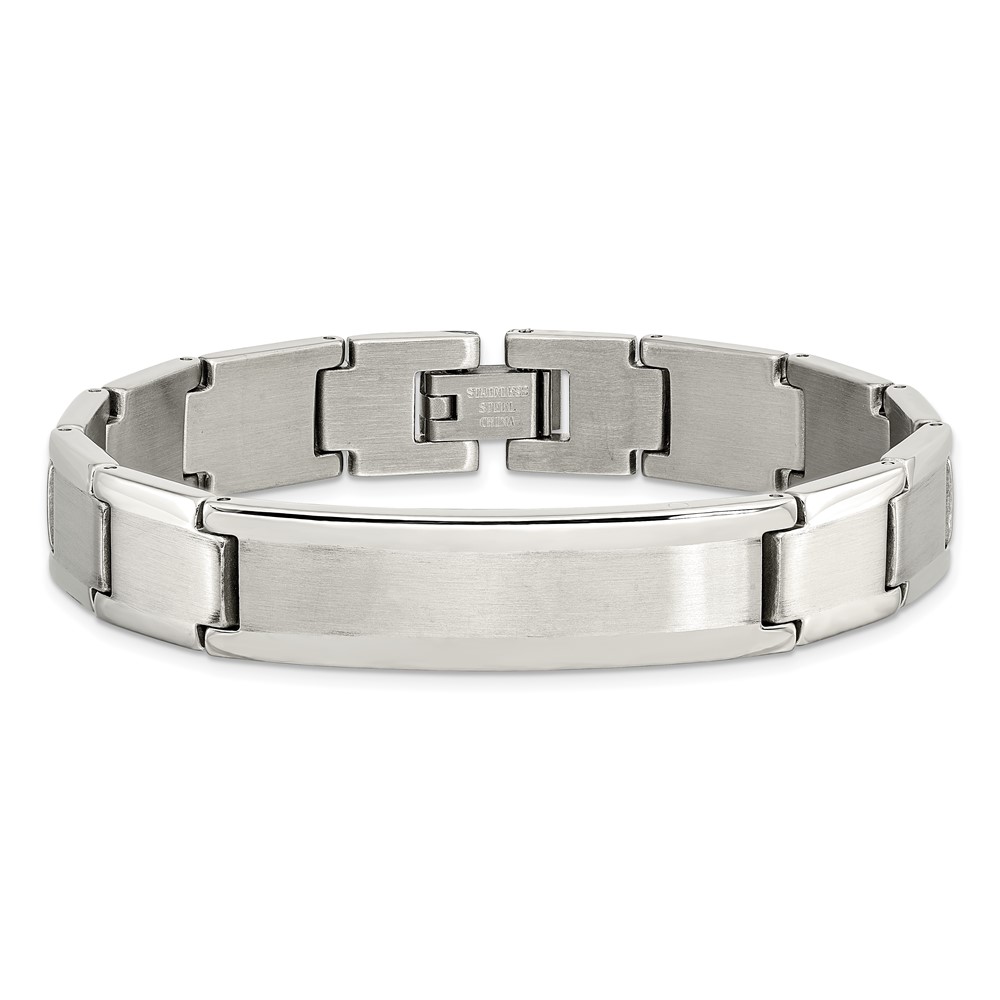 Finish:Polished & Brushed Length of Item:8.5-inch Chain Length:8.25-inch Chain Type:Link, Other Clasp /Connector:Fold Over Catch Material: Primary:Stainless Steel Width of Item:11.5 mm Engravable:Yes Packaging:Gift Boxed Product Type:Jewelry Jewelry Type:Bracelets Sold By Unit:Each Bracelet Type:ID Bracelets Gender:Men’s Material: Primary – Color:White Men’s Type:Bracelet Items per Pack:1