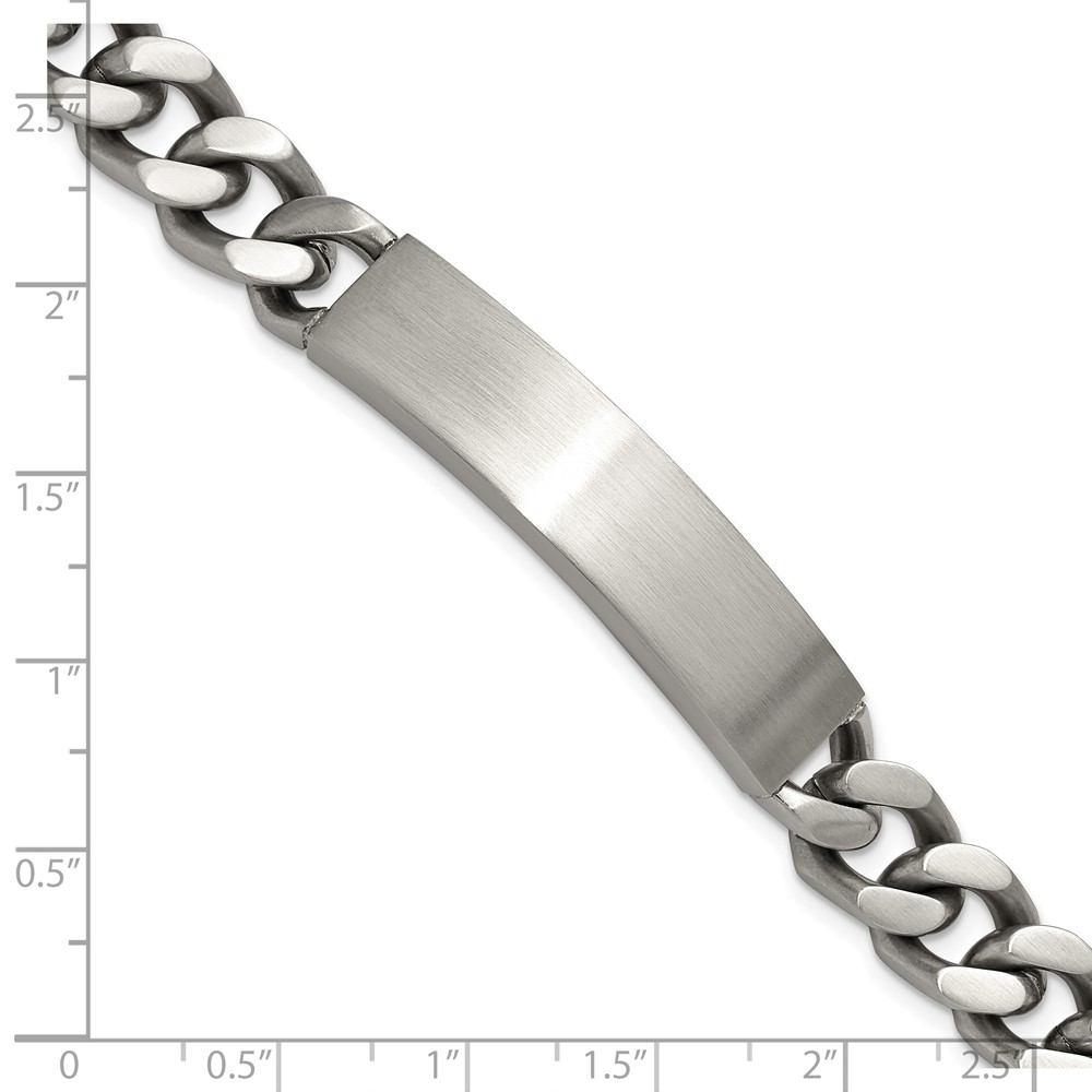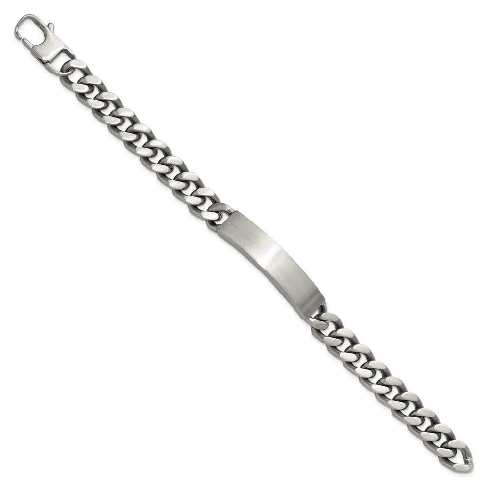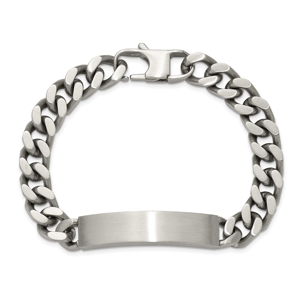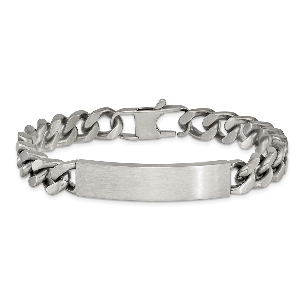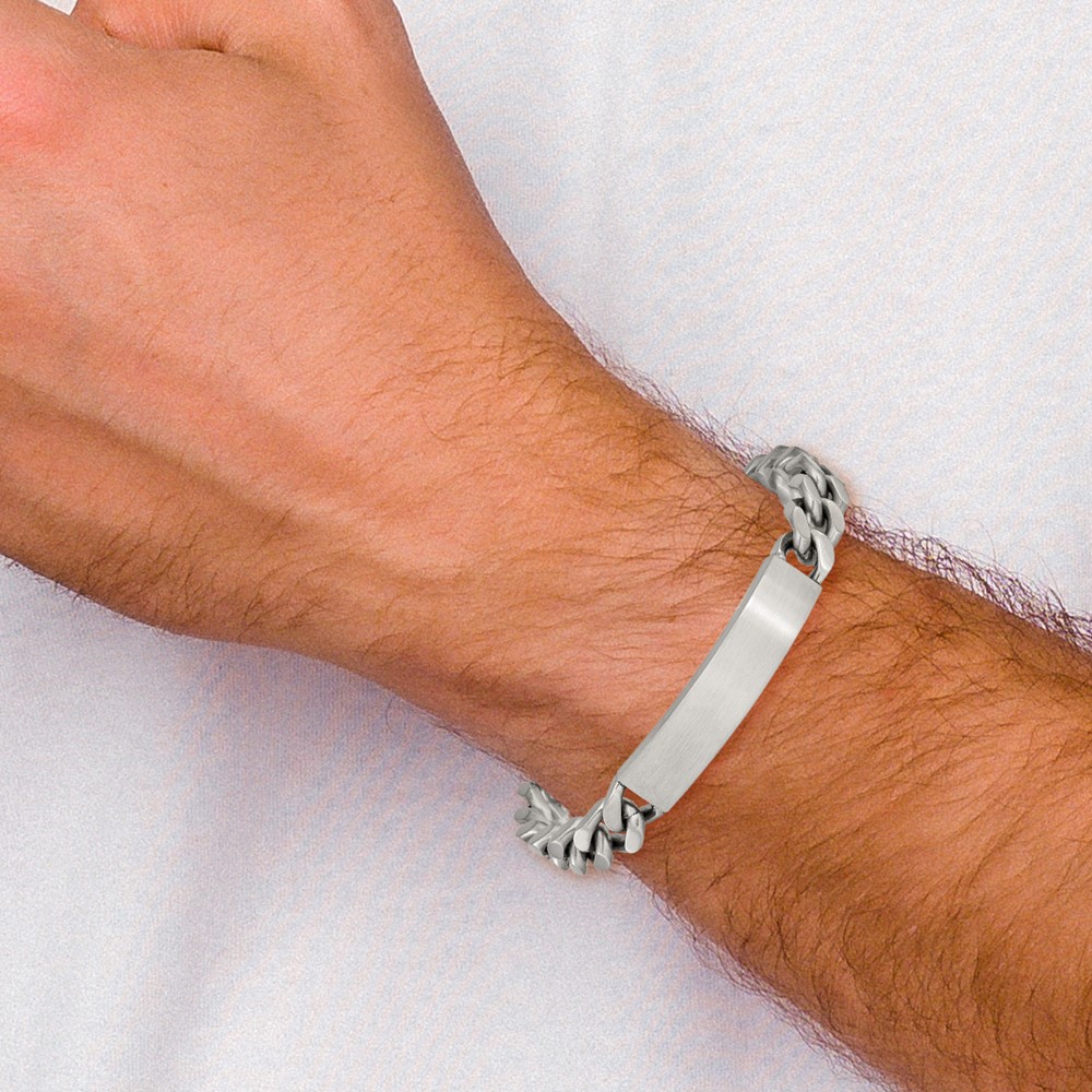 Finish:Polished & Brushed Length of Item:8.5-inch Chain Length:8.5-inch Chain Type:Curb Chain Width:10 mm Clasp /Connector:Lobster (Fancy) Material: Primary:Stainless Steel Width of Item:10 mm Engravable:Yes Packaging:Gift Pouch Product Type:Jewelry Jewelry Type:Bracelets Sold By Unit:Each Bracelet Type:ID Bracelets Gender:Men’s Material: Primary – Color:White
