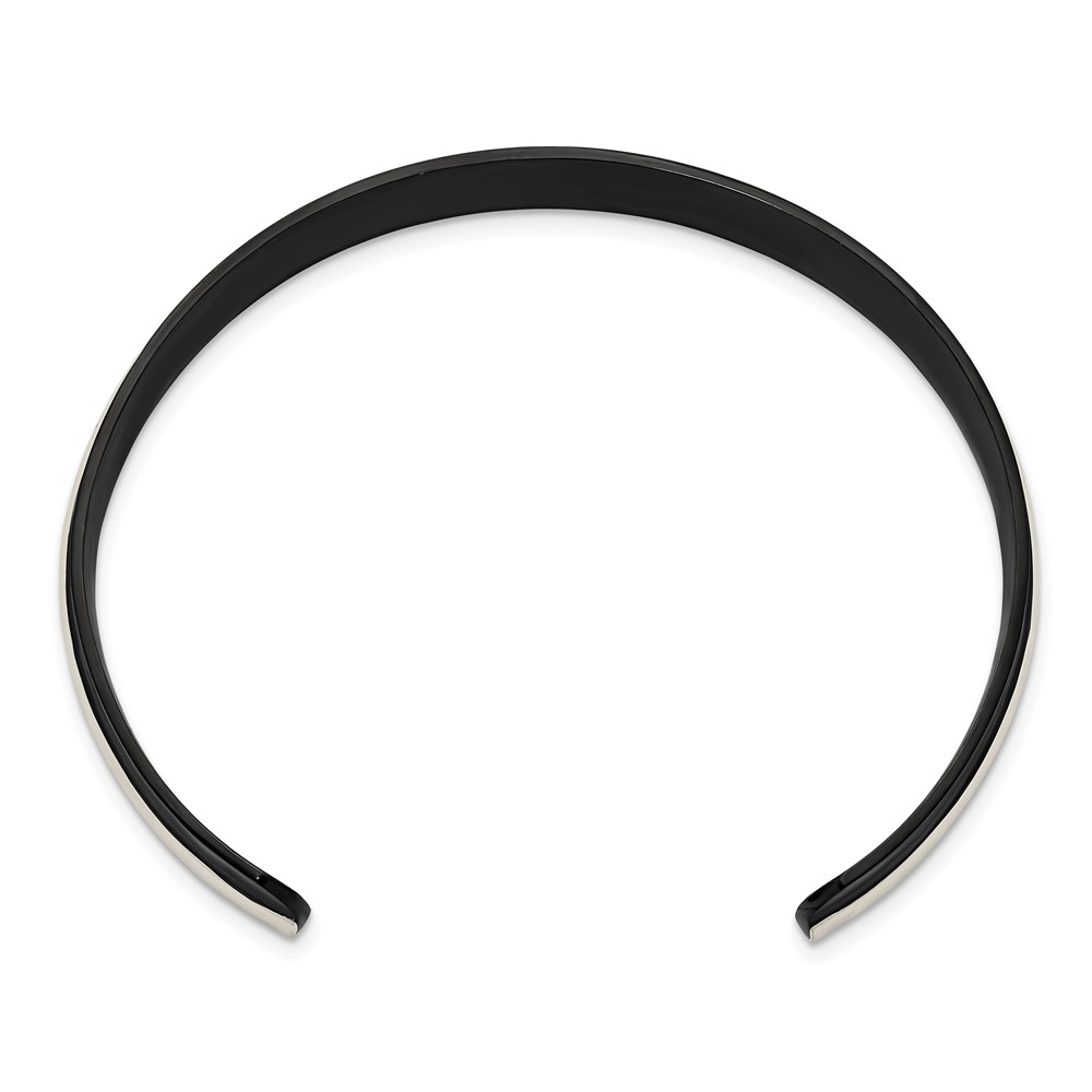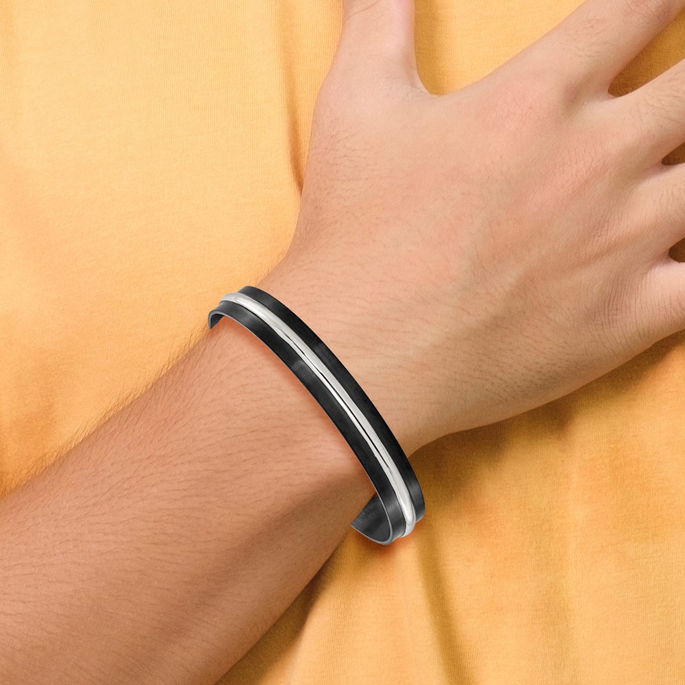 Finish:Polished & Brushed Plating:IP-Plated Clasp /Connector:Slip On (No Clasp) Feature:Slip On Material: Primary:Stainless Steel Width of Item:10 mm Packaging:Gift Pouch Product Type:Jewelry Jewelry Type:Bracelets Sold By Unit:Each Bracelet Type:Bangle Gender:Men’s Material: Primary – Color:White Plating Color:Black