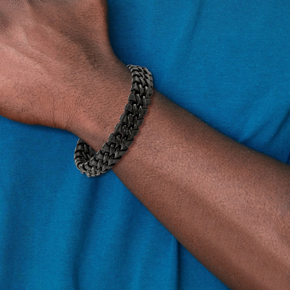Stainless Steel Brushed Black IP-plated Black Leather 8.5-inch Bracelet