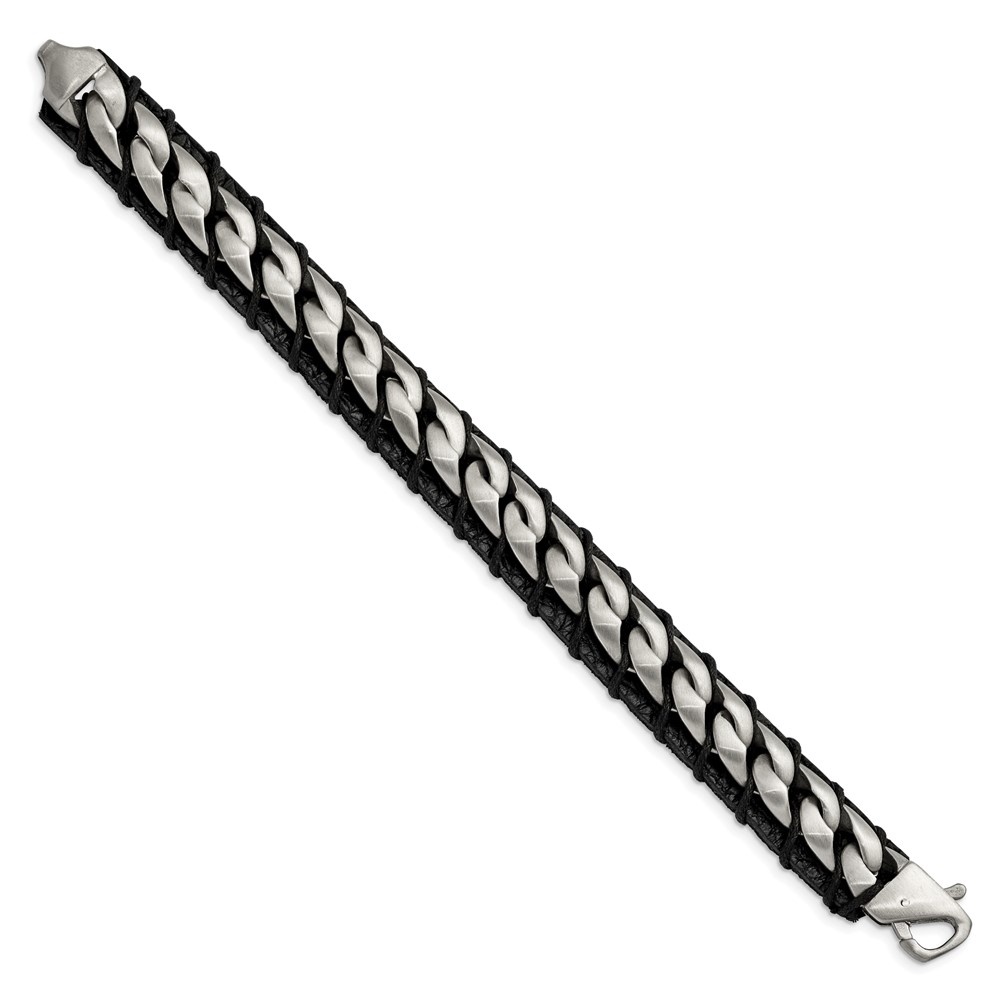 Finish:Brushed Length of Item:8.5-inch Material: Accents:Leather Material: Accent Color 1:Black Chain Length:8.5-inch Chain Type:Curb Clasp /Connector:Lobster (Fancy) Material: Primary:Stainless Steel Width of Item:15 mm Packaging:Gift Pouch Product Type:Jewelry Jewelry Type:Bracelets Sold By Unit:Each Bracelet Type:Contemporary Gender:Men’s Material: Primary – Color:White Items per Pack:1