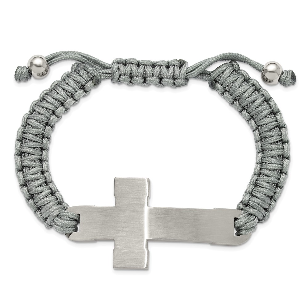 Stainless Steel Brushed/Polished Cross Grey Nylon Adj 7.5-10.5-inch Bracelet