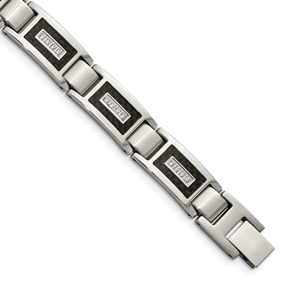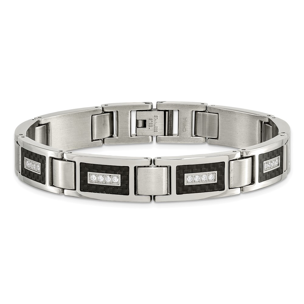 Stainless Steel Brushed & Polished w/CZ Black Carbon Fiber Inlay Bracelet