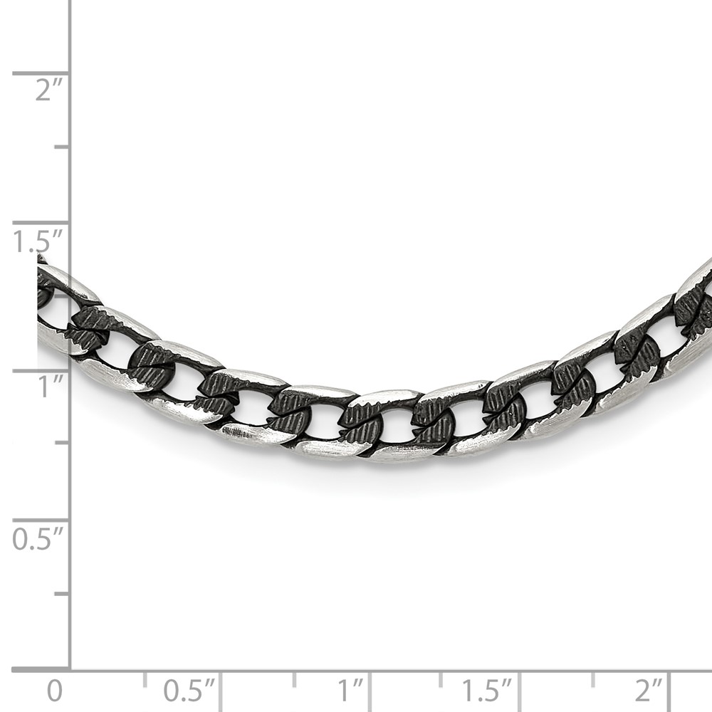 Finish:Brushed Length of Item:24 in Chain Length:24 in Chain Type:Curb Chain Width:6.75 mm Clasp /Connector:Lobster (Fancy) Material: Primary:Stainless Steel Width of Item:6.75 mm Packaging:Gift Pouch Product Type:Jewelry Jewelry Type:Chains Sold By Unit:Each Necklace Type:Chain Styles Gender:Men’s Texture:Textured Material: Primary – Color:White Plating Color:Black Plating: Chain:IP-Plated