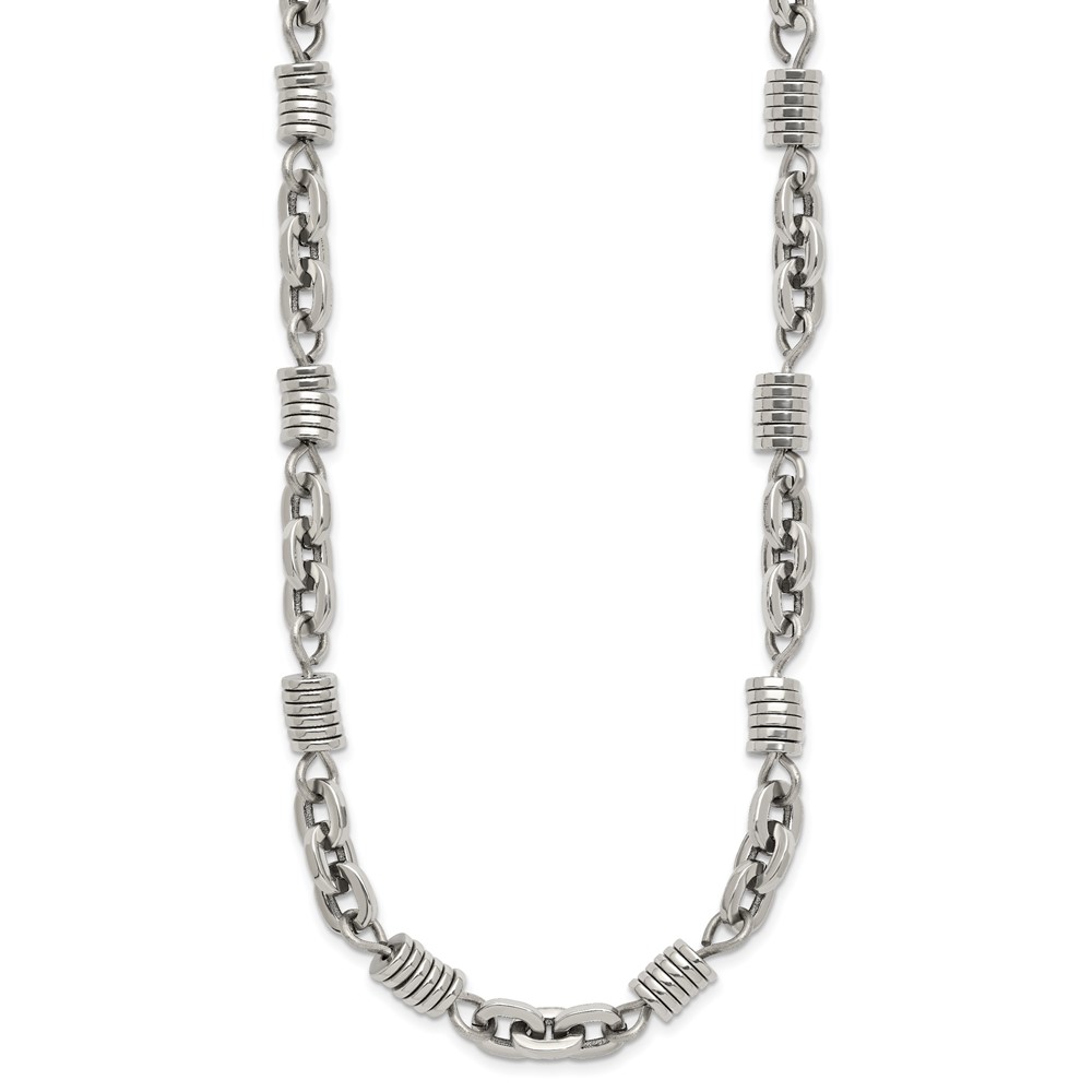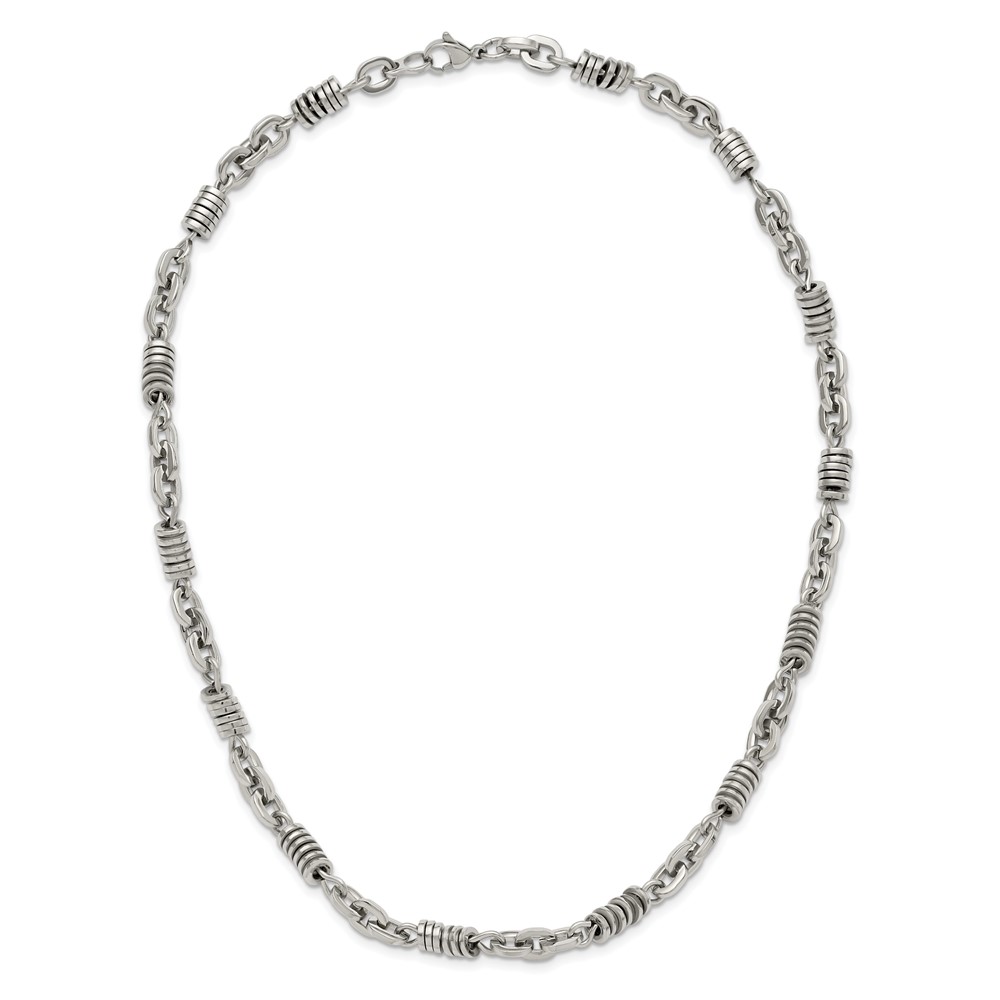 Finish:Polished Length of Item:20 in Chain Length:20 in Chain Type:Other Chains Chain Width:6 mm Clasp /Connector:Lobster (Fancy) Material: Primary:Stainless Steel Width of Item:6 mm Packaging:Gift Pouch Product Type:Jewelry Jewelry Type:Chains Sold By Unit:Each Necklace Type:Chain Styles Gender:Men’s Material: Primary – Color:White