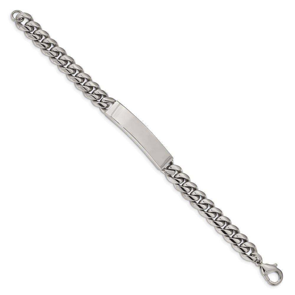 Finish:Polished Length of Item:8.25-inch Chain Length:8.25-inch Chain Type:Curb Chain Width:10 mm Charm/Element Length:45 mm Charm/Element Width:9.83 mm Clasp /Connector:Lobster (Fancy) Feature:Solid Manufacturing Process:Casted Material: Primary:Stainless Steel Width of Item:10 mm Engravable:Yes Packaging:Gift Boxed Product Type:Jewelry Jewelry Type:Bracelets Sold By Unit:Each Bracelet Type:ID Bracelets Gender:Men’s Material: Primary – Color:White Number of Elements:1 Items per Pack:1