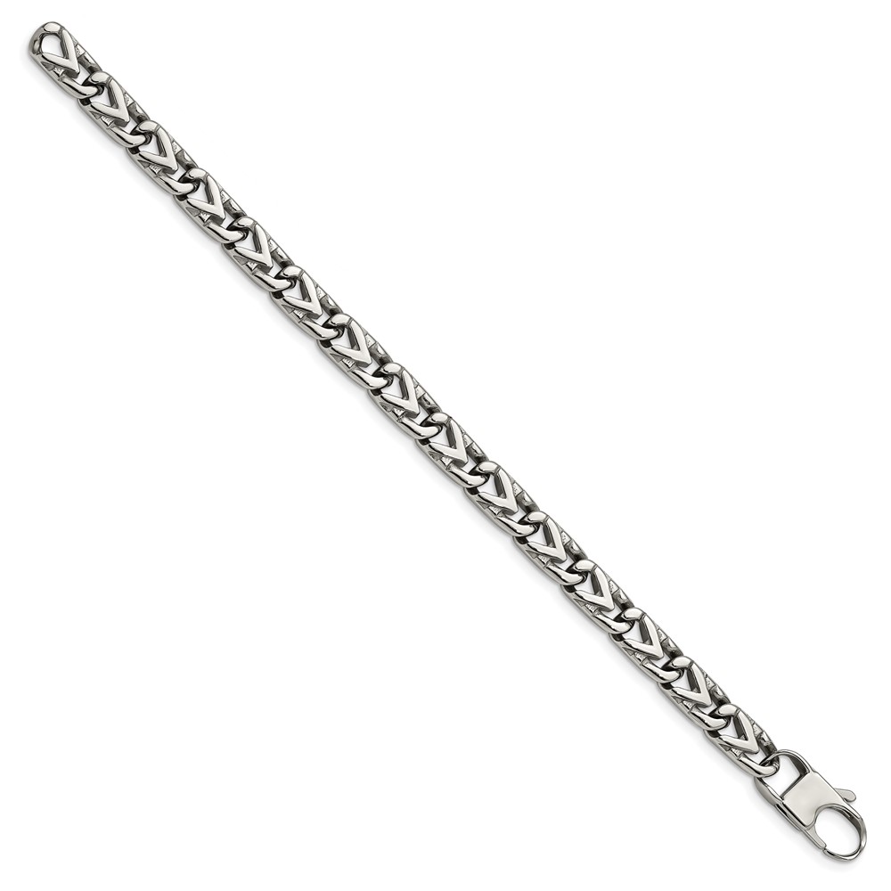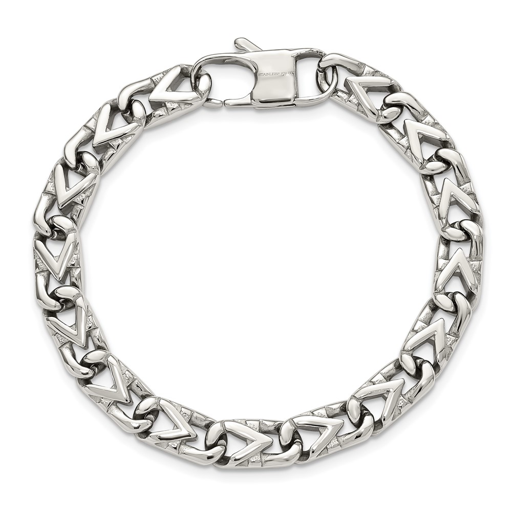 Finish:Polished Length of Item:8.5-inch Chain Length:8.5-inch Chain Type:Link, Other Chain Width:8 mm Clasp /Connector:Lobster Material: Primary:Stainless Steel Packaging:Gift Pouch Product Type:Jewelry Jewelry Type:Bracelets Sold By Unit:Each Bracelet Type:Contemporary Gender:Unisex Material: Primary – Color:White Items per Pack:1
