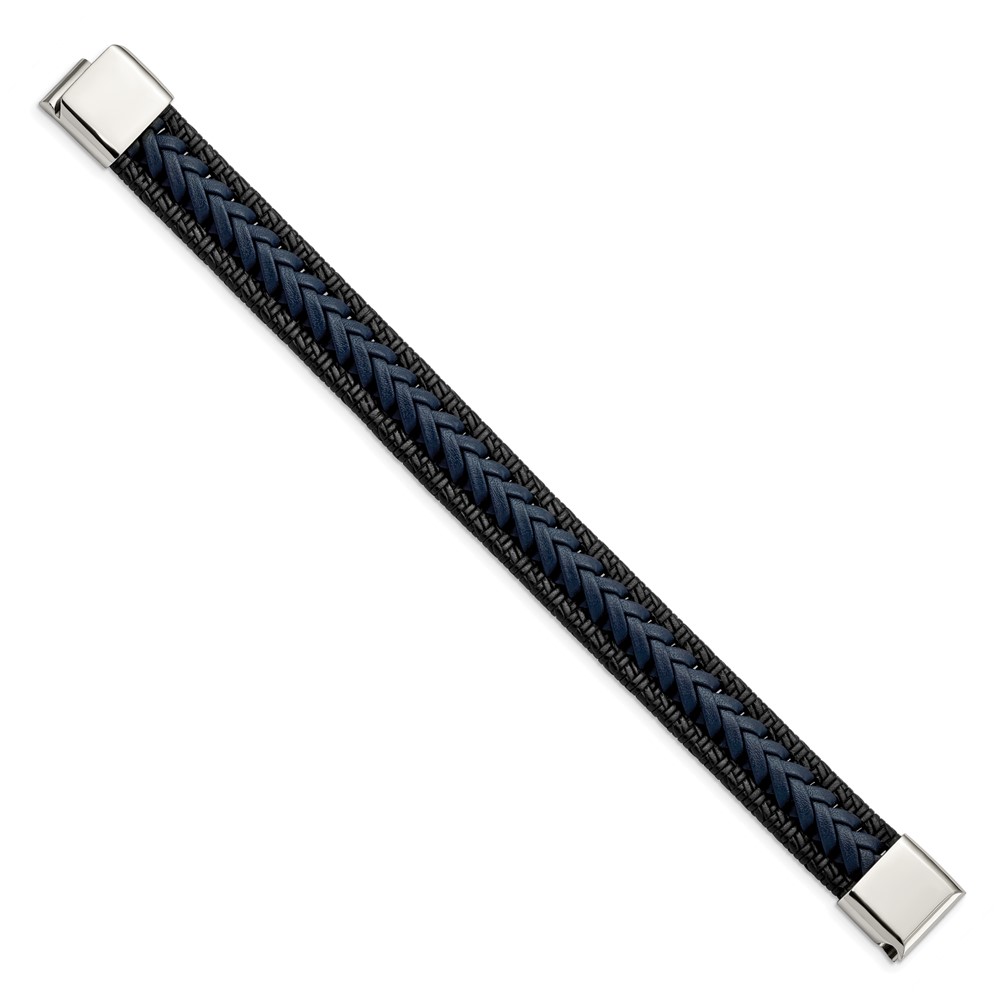 Stainless Steel Polished Black/Blue Braided Leather 8.25-inch Bracelet