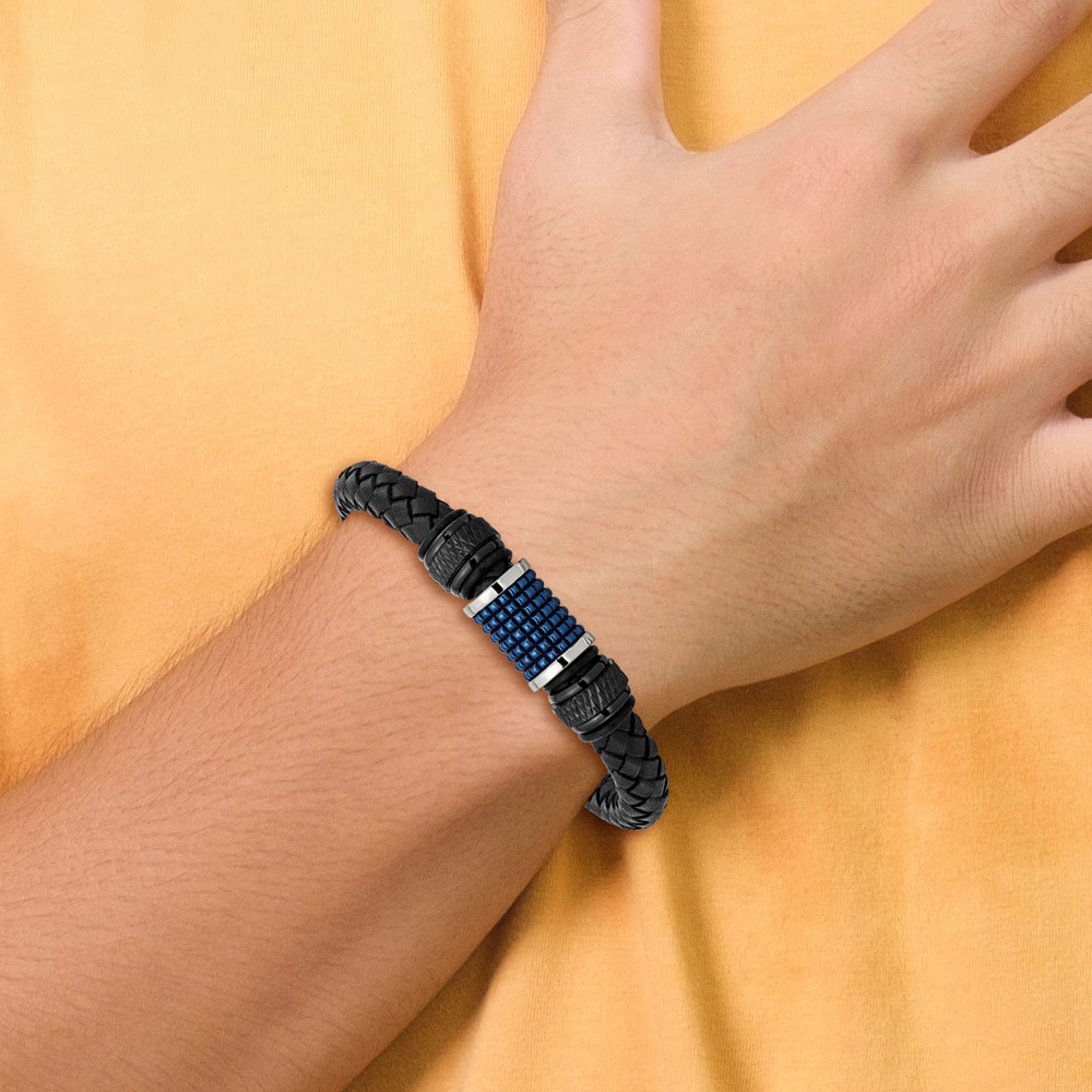 Finish:Polished Length of Item:8.5-inch Material: Accents:Leather Plating:IP-Plated Material: Accent Color 1:Blue Chain Length:8.5-inch Chain Type:Leather Clasp /Connector:Push Clasp Material: Primary:Stainless Steel Width of Item:10 mm Material: Other:Rubber Packaging:Gift Pouch Product Type:Jewelry Jewelry Type:Bracelets Sold By Unit:Each Bracelet Type:Men’s Gender:Men’s Material: Primary – Color:White Men’s Type:Bracelet Items per Pack:1 Plating Color:Black Material: Accent Color 2:Black