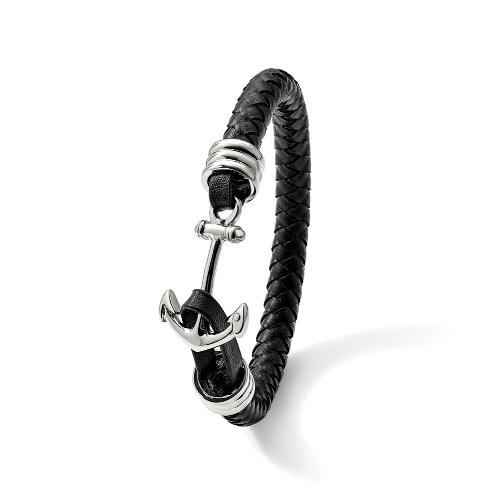 Stainless Steel Polished Black Braided Leather Anchor 8.5-inch Bracelet