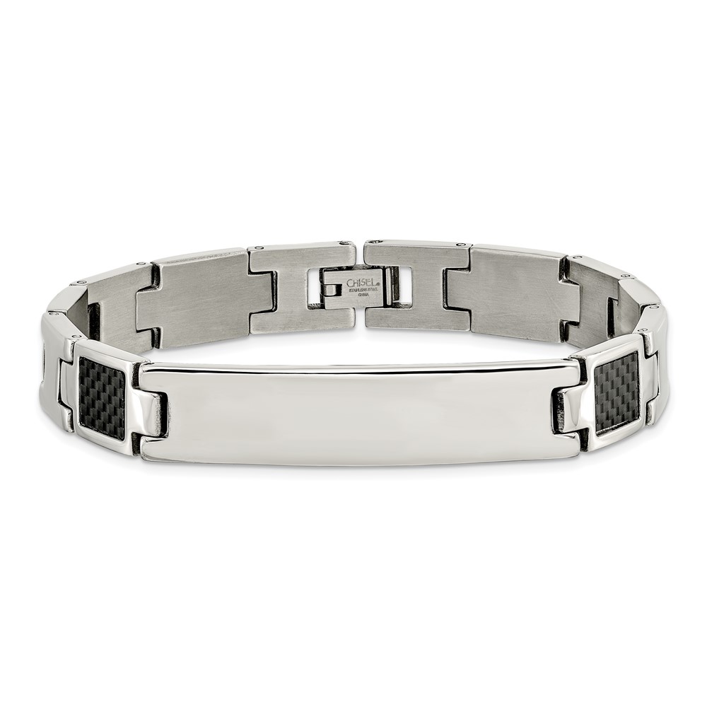 Finish:Polished & Brushed Length of Item:8.5-inch Material: Accent Color 1:Black Chain Length:8.5-inch Chain Type:Link, Other Chain Width:9 mm Clasp /Connector:Fold Over Catch Material: Primary:Stainless Steel Engravable:Yes Packaging:Gift Boxed Product Type:Jewelry Jewelry Type:Bracelets Sold By Unit:Each Bracelet Type:ID Bracelets Gender:Men’s Material:-inchlay:Carbon Fiber Material: Primary – Color:White Items per Pack:1