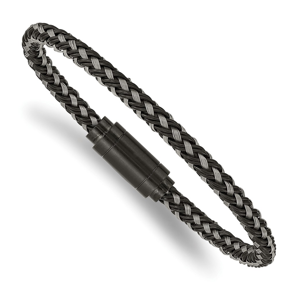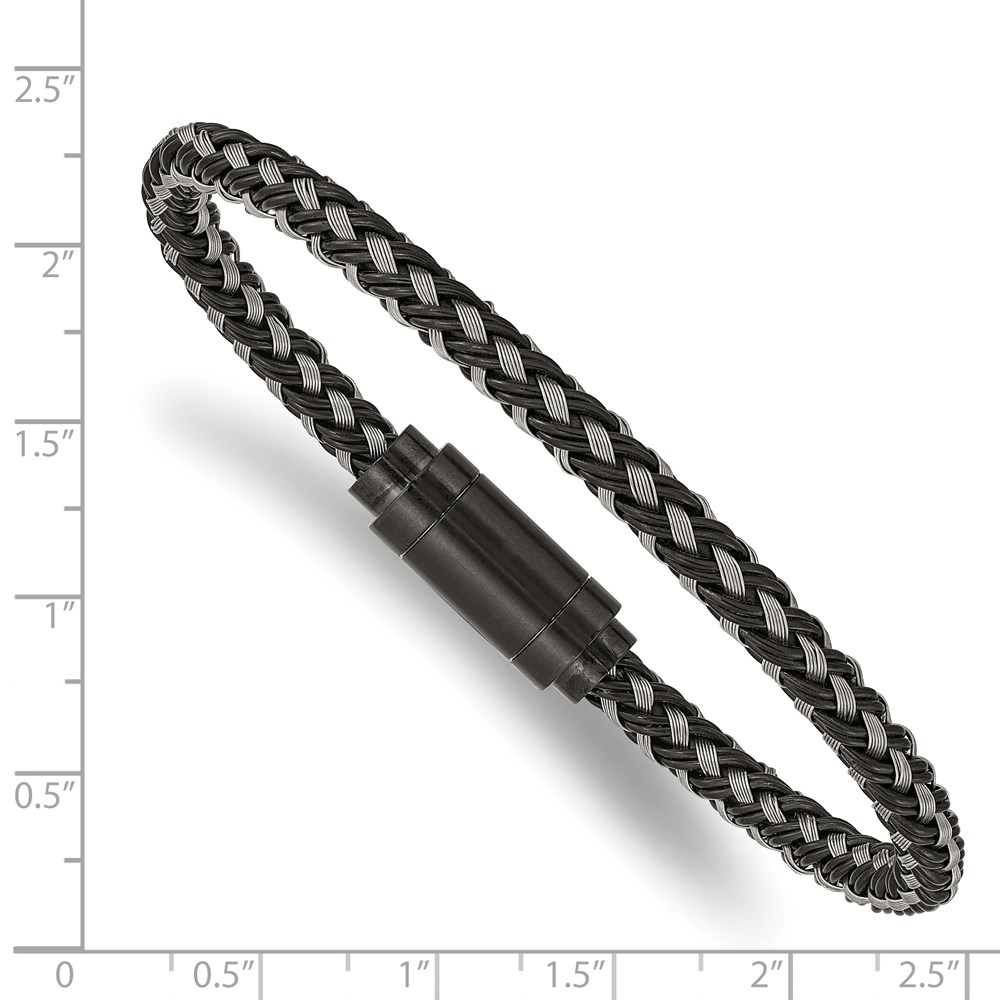 Stainless Steel Polished Black IP Braided Wire & Rubber 8.25-inch Bracelet