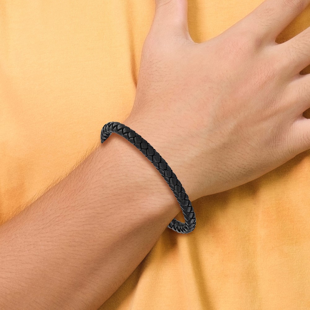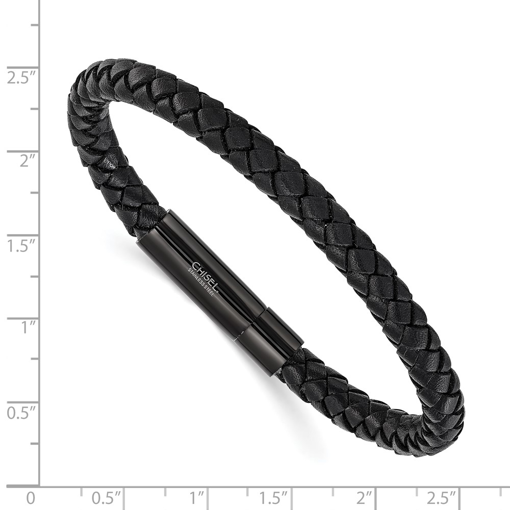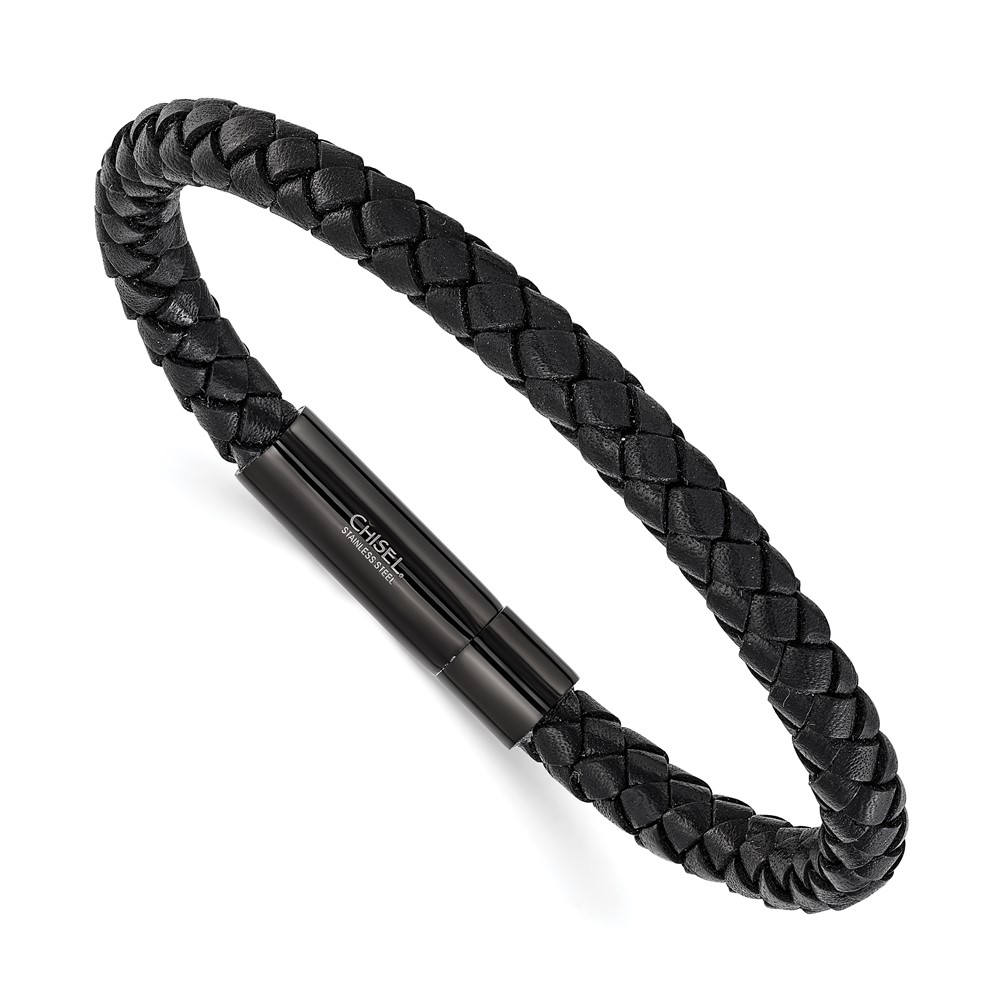 Finish:Polished Length of Item:8.25-inch Material: Accents:Leather Plating:IP-Plated Material: Accent Color 1:Black Clasp /Connector:Barrel Material: Primary:Stainless Steel Width of Item:6.5 mm Engravable:Not Recommended Packaging:Gift Pouch Product Type:Jewelry Jewelry Type:Bracelets Sold By Unit:Each Bracelet Type:Cord, Leather & Rubber Gender:Men’s Material: Primary – Color:White Plating Color:Black