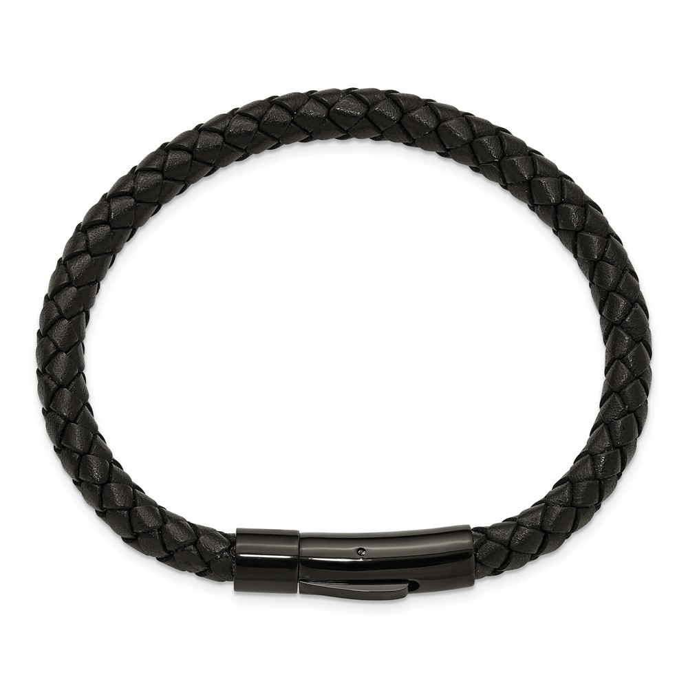 Stainless Steel Polished Black IP-plated Black Leather 8.25-inch Bracelet