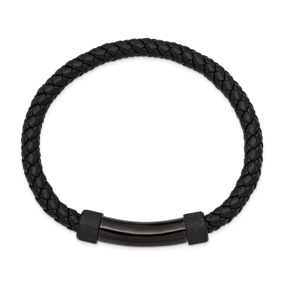 Stainless Steel Polished Black IP-plated Black Leather 8.25-inch Bracelet