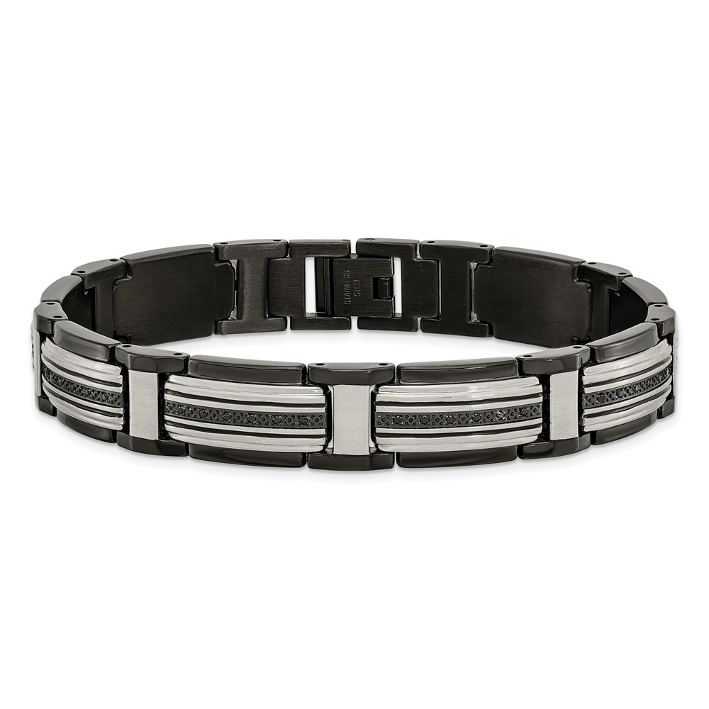 Finish:Polished Length of Item:8.75-inch Plating:IP-Plated Chain Length:8.75-inch Chain Type:Link, Other Clasp /Connector:Fold Over Catch Material: Primary:Stainless Steel Width of Item:12 mm Packaging:Gift Boxed Product Type:Jewelry Jewelry Type:Bracelets Sold By Unit:Each Bracelet Type:Contemporary Gender:Men’s Material: Primary – Color:White Items per Pack:1 Plating Color:Black