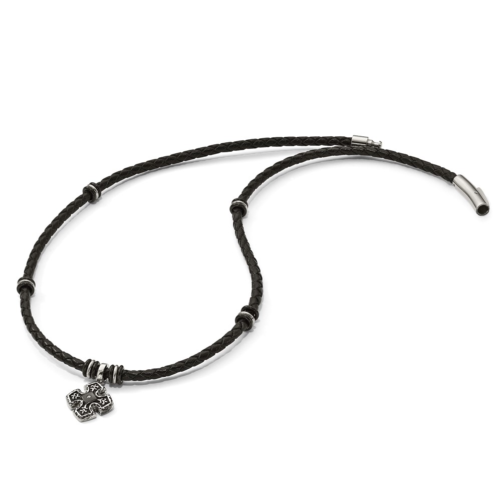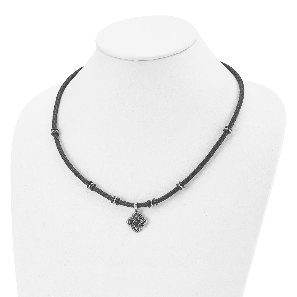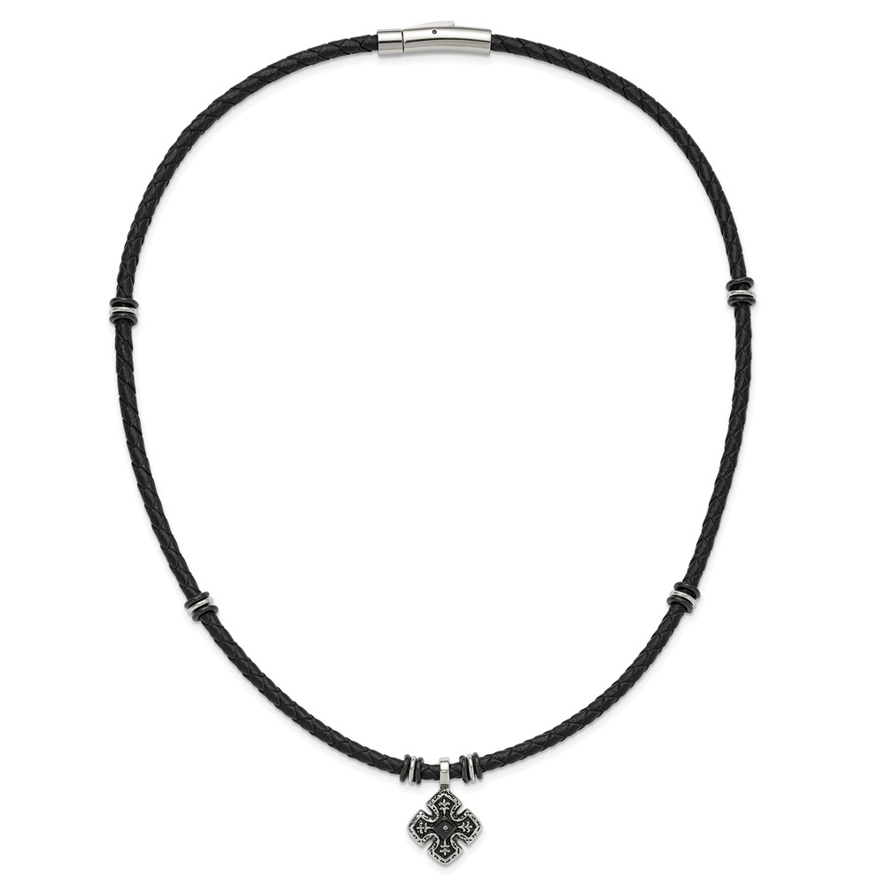 Finish:Polished Length of Item:21-inch Chain Length:21-inch Chain Type:Cord Chain Width:4 mm Clasp /Connector:Barrel Material: Primary:Stainless Steel Packaging:Gift Boxed Product Type:Jewelry Jewelry Type:Necklaces Sold By Unit:Each Necklace Type:Themed Necklace Pendant/Charm Type:Themed Gender:Men’s Material: Primary – Color:White Plating Color:Black Plating: Chain:IP-Plated Plating: Charm/Element:IP-Plated Material: Chain Only:Leather