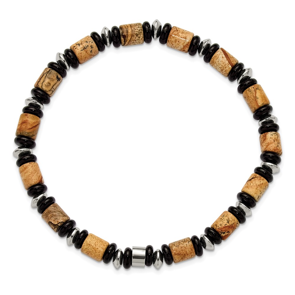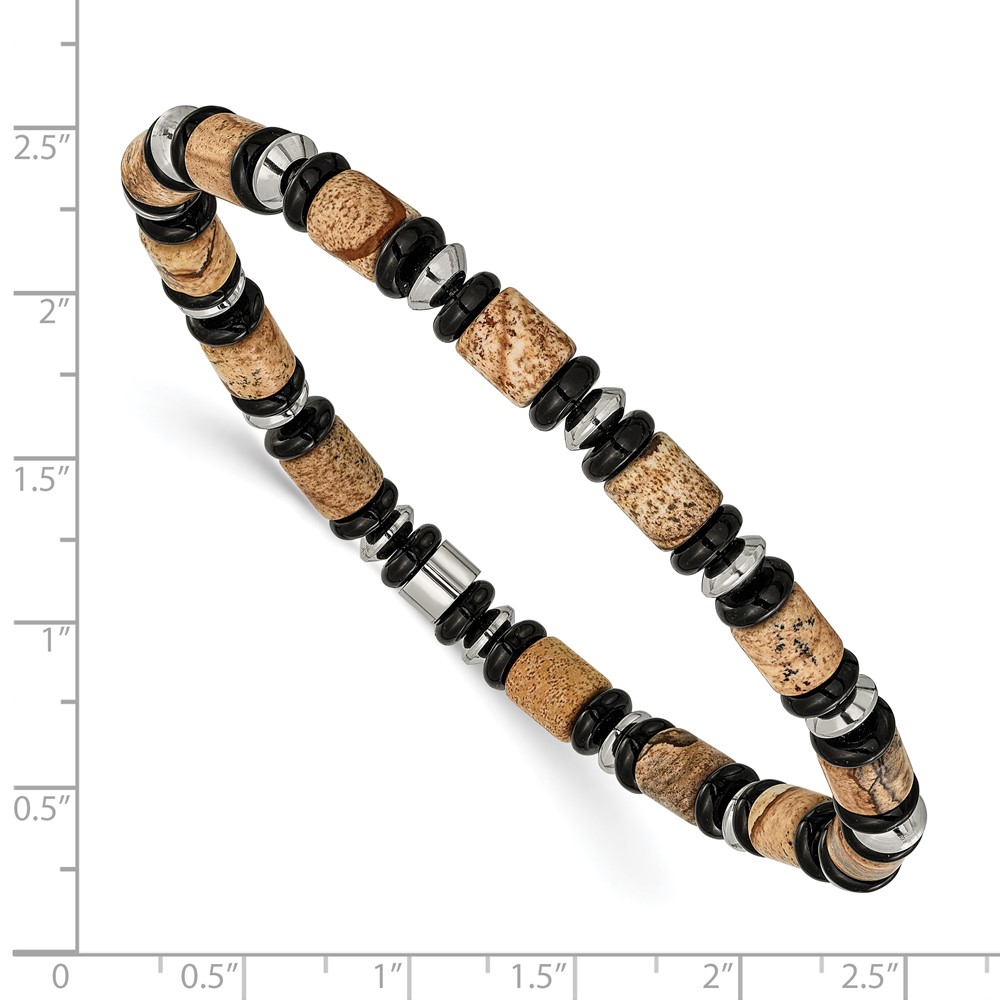 Stainless Steel Polished Black Onyx/Picture Jasper 8-inch Stretch Bracelet