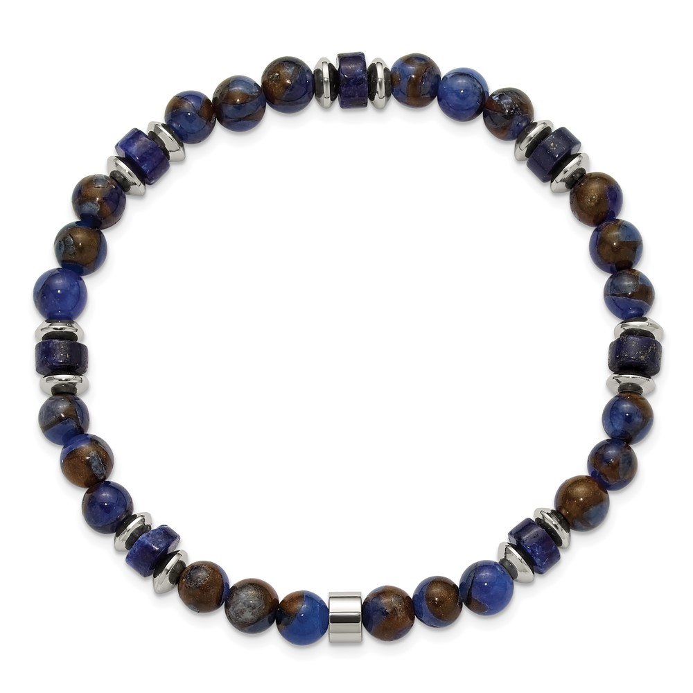 Stainless Steel Polished Blue Golden/Lapis Bead 7.75-inch Stretch Bracelet