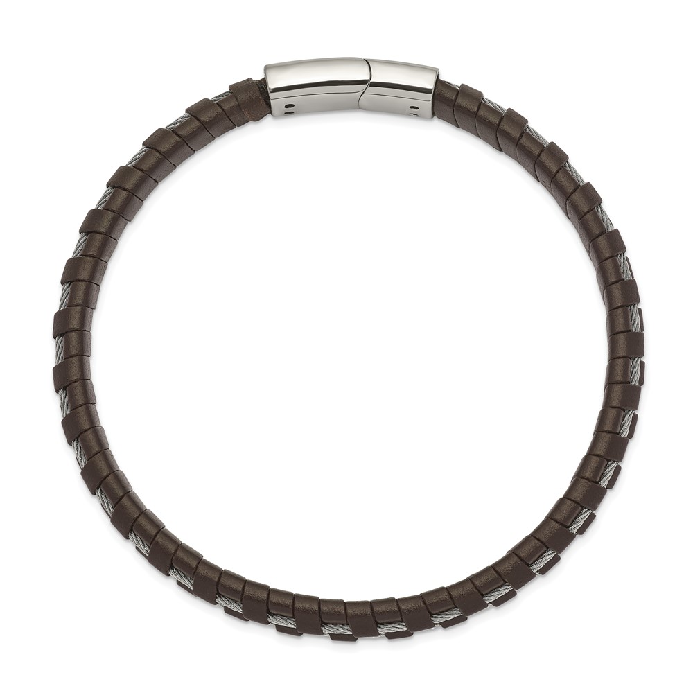 Stainless Steel Polished Cable and Brown Leather 8.75-inch Bracelet