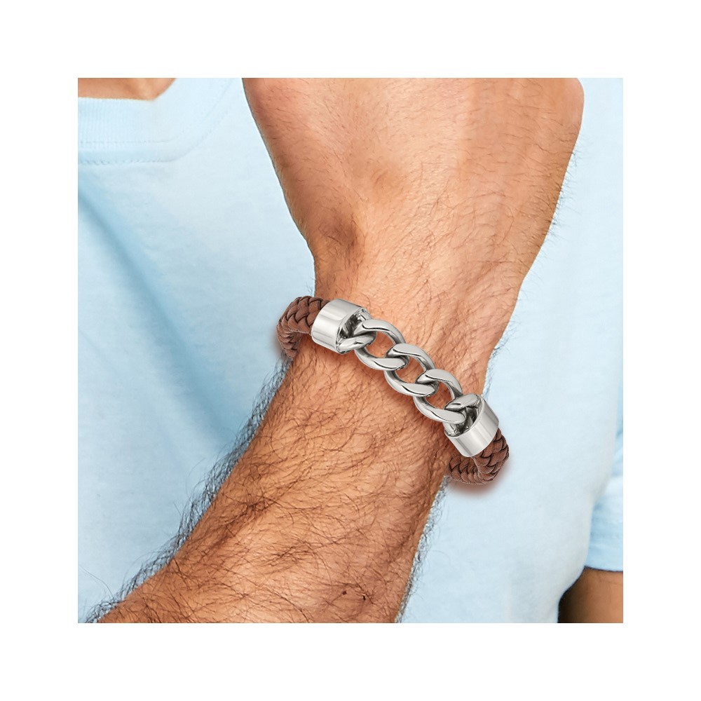 Stainless Steel Polished Cha-inch and Brown Leather 8.25-inch Bracelet