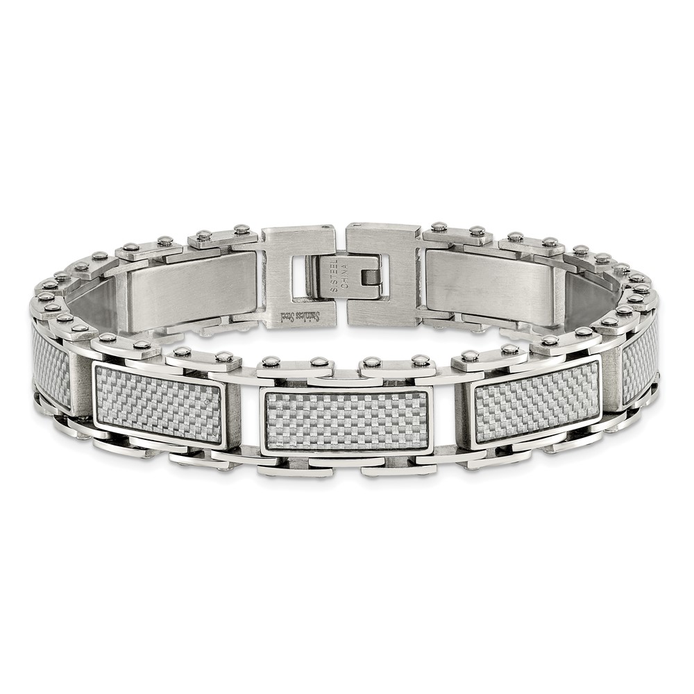 Finish:Polished Length of Item:8.5-inch Material: Accent Color 1:Grey Chain Length:8.5-inch Chain Type:Link, Other Chain Width:14 mm Clasp /Connector:Fold Over Catch Material: Primary:Stainless Steel Width of Item:14 mm Packaging:Gift Boxed Product Type:Jewelry Jewelry Type:Bracelets Sold By Unit:Each Bracelet Type:Contemporary Gender:Men’s Material:-inchlay:Carbon Fiber Material: Primary – Color:White Items per Pack:1