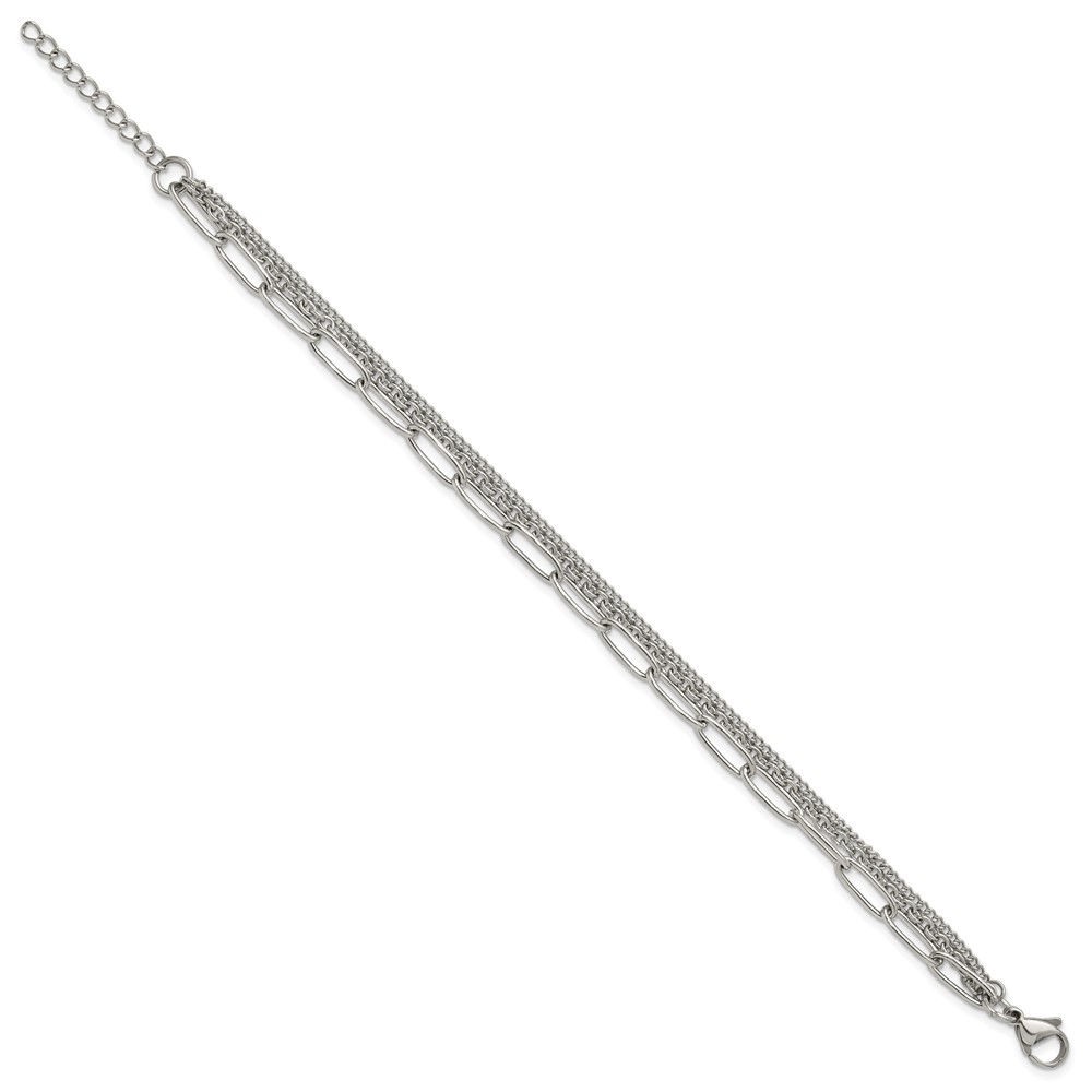 Finish:Polished Length of Item:8.25-inch Chain Length:7-inch Chain Type:Other Chains Clasp /Connector:Lobster (Fancy) Extender Length:1.25-inch Feature:Multi-Strands Material: Primary:Stainless Steel Width of Item:4 mm Packaging:Gift Pouch Product Type:Jewelry Jewelry Type:Bracelets Sold By Unit:Each Bracelet Type:Fancy Gender:Women’s Material: Primary – Color:White