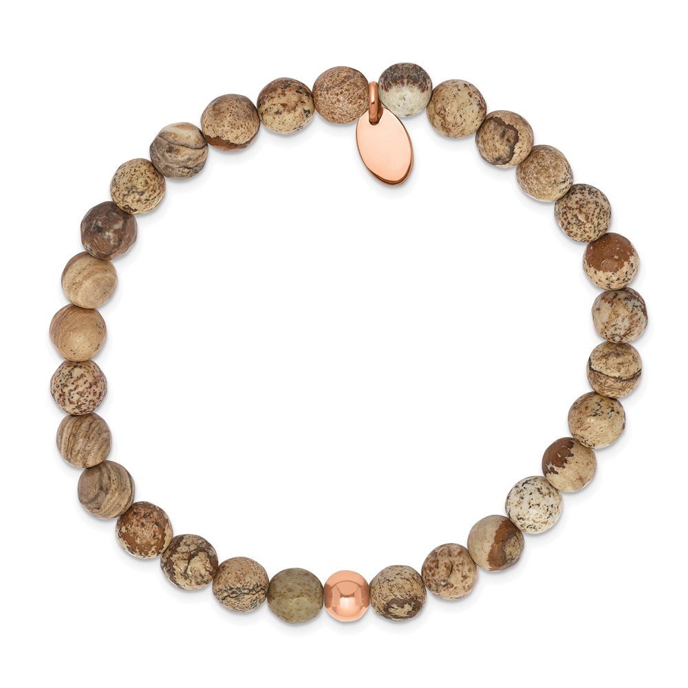Stainless Steel Polished Rose IP-plated Brown Jasper Stretch Bracelet