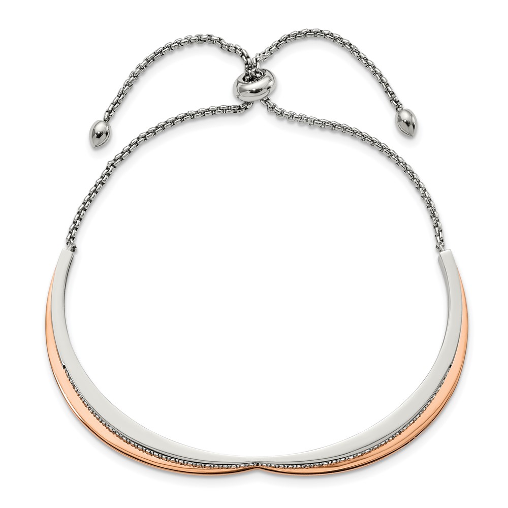 Finish:Polished Length of Item:Up to 9.5-inch Plating:IP-Plated Chain Type:Box Chain Width:1 mm Clasp /Connector:Slip On (No Clasp) Feature:Adjustable Material: Primary:Stainless Steel Width of Item:4 mm Packaging:Gift Pouch Product Type:Jewelry Jewelry Type:Bracelets Sold By Unit:Each Bracelet Type:Adjustable & Stretch & Wrap Gender:Women’s Material: Primary – Color:White Items per Pack:1 Plating Color:Rose Tone