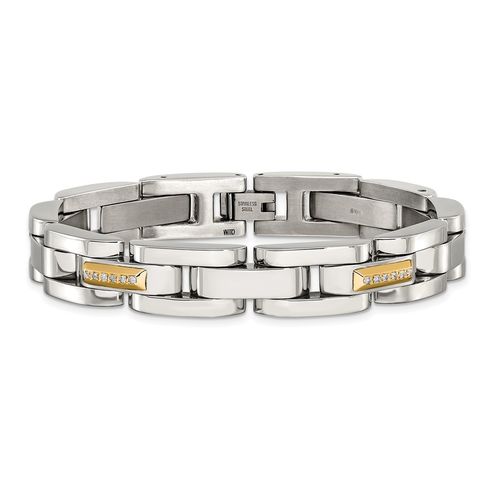 Finish:Polished Length of Item:8.25-inch Material: Accents:14K Gold Material: Accent Color 1:Gold Chain Length:8.25-inch Clasp /Connector:Fold Over Catch Material: Primary:Stainless Steel Width of Item:11 mm Packaging:Gift Boxed Product Type:Jewelry Jewelry Type:Bracelets Sold By Unit:Each Bracelet Type:Links Gender:Men’s Material: Primary – Color:White