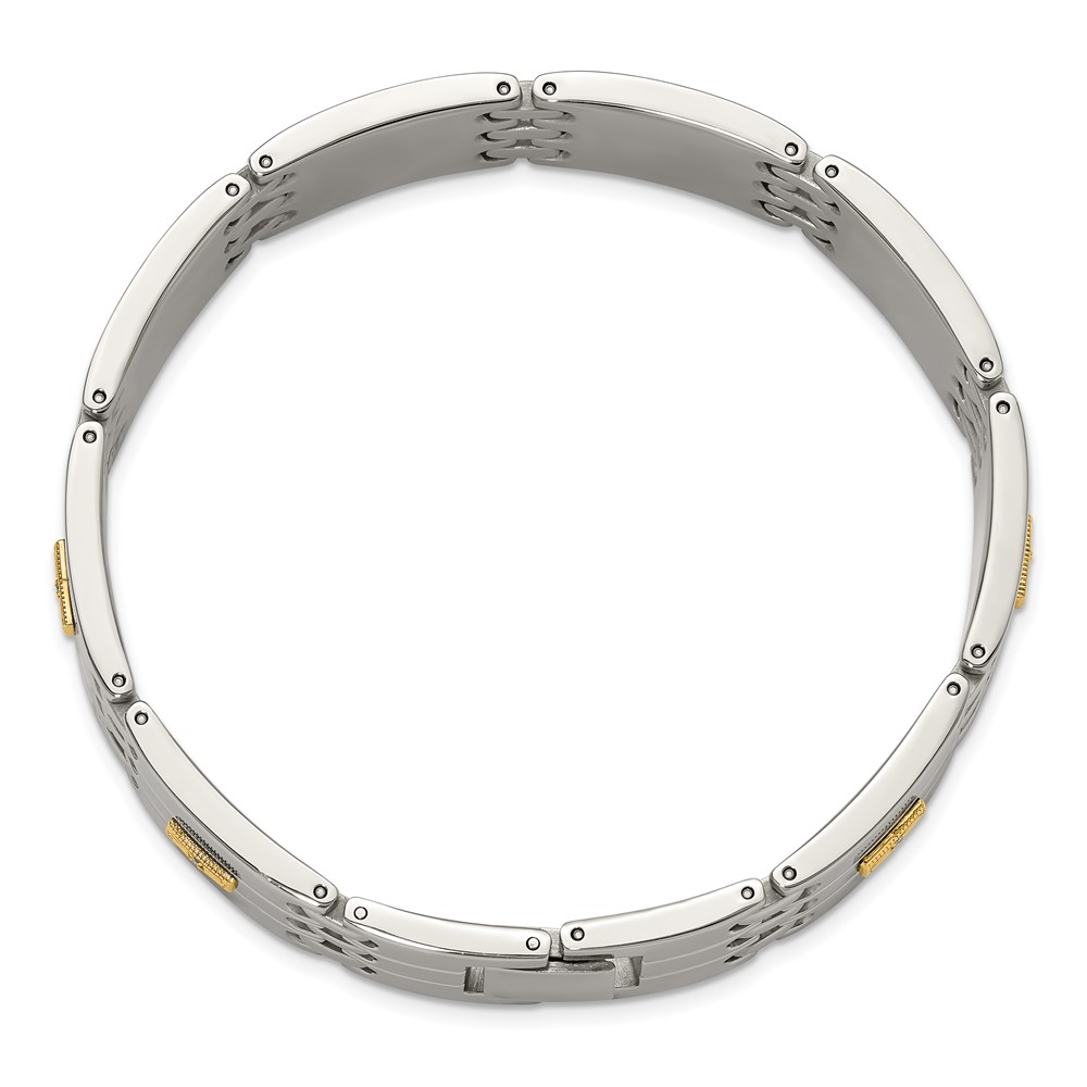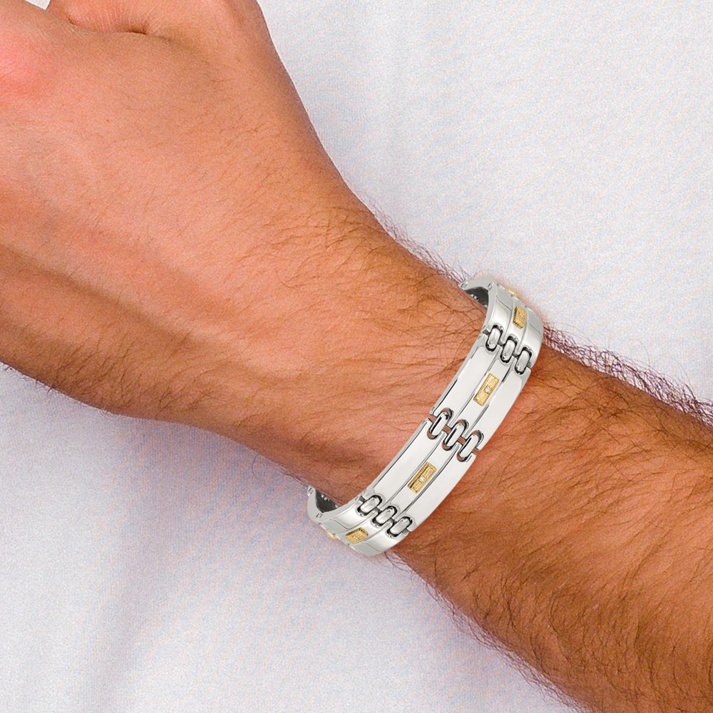 Finish:Polished Length of Item:8.5-inch Material: Accents:14K Gold Material: Accent Color 1:Gold Chain Length:8.5-inch Clasp /Connector:Fold Over Catch Material: Primary:Stainless Steel Width of Item:14 mm Packaging:Gift Boxed Product Type:Jewelry Jewelry Type:Bracelets Sold By Unit:Each Bracelet Type:Links Gender:Men’s Material: Primary – Color:White