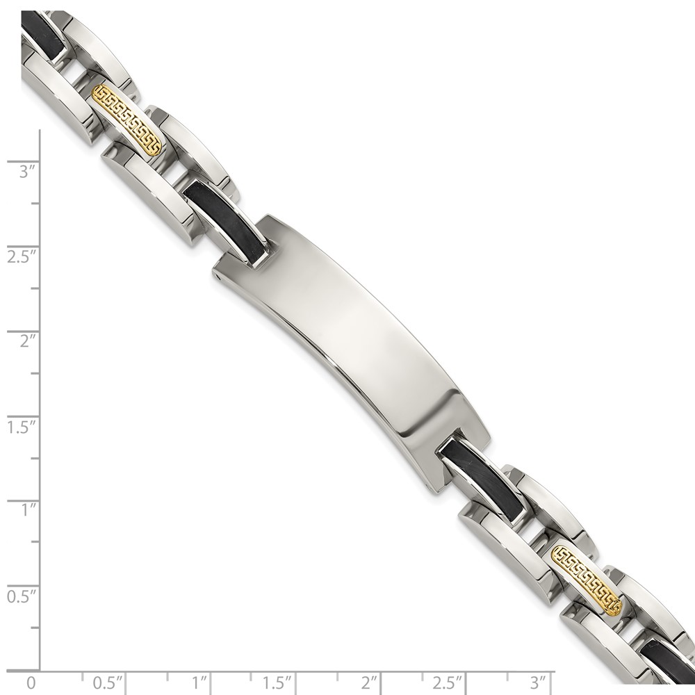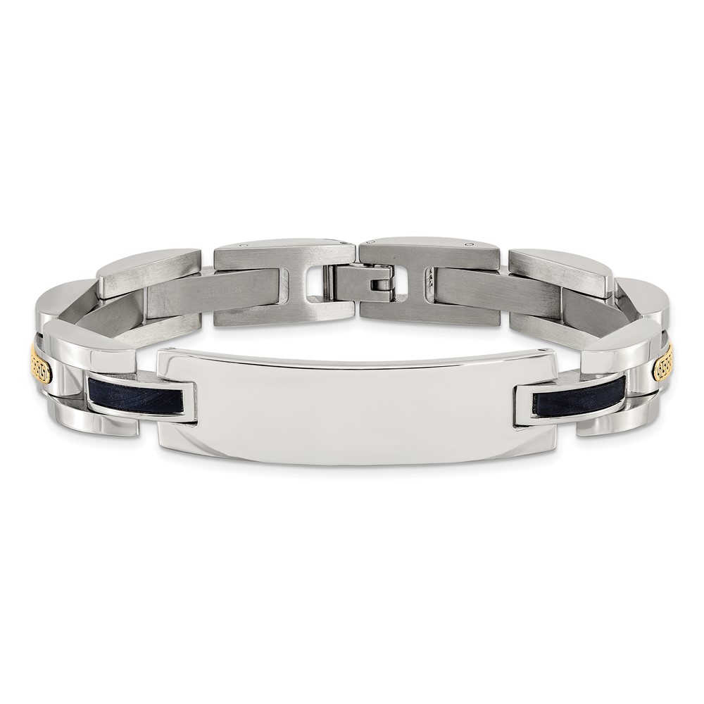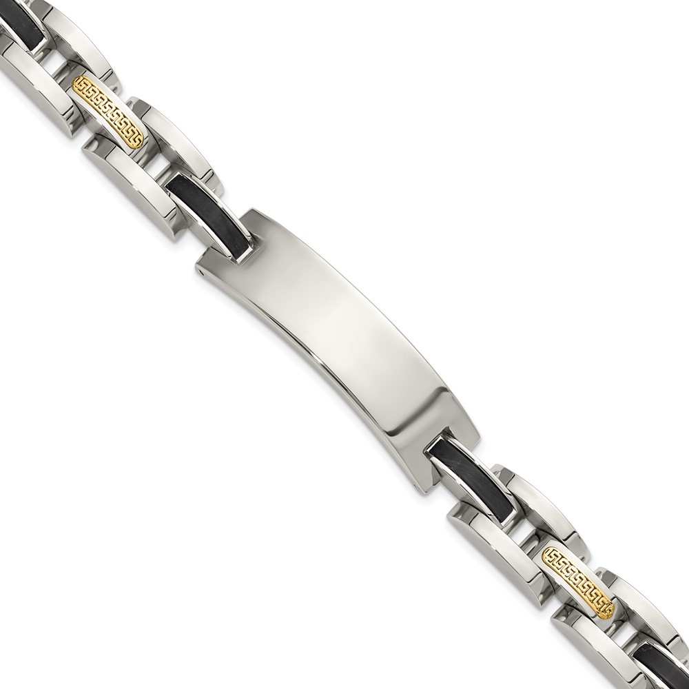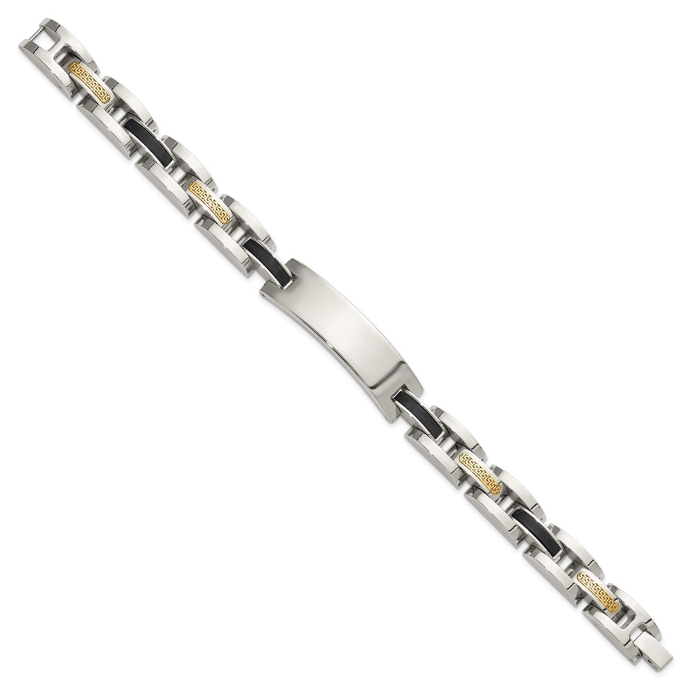 Finish:Polished Length of Item:8.75-inch Material: Accents:14K Gold Material: Accent Color 1:Gold Chain Length:8.75-inch Clasp /Connector:Fold Over Catch Material: Primary:Stainless Steel Width of Item:11 mm Packaging:Gift Boxed Product Type:Jewelry Jewelry Type:Bracelets Sold By Unit:Each Bracelet Type:ID Bracelets Gender:Men’s Material: Primary – Color:White