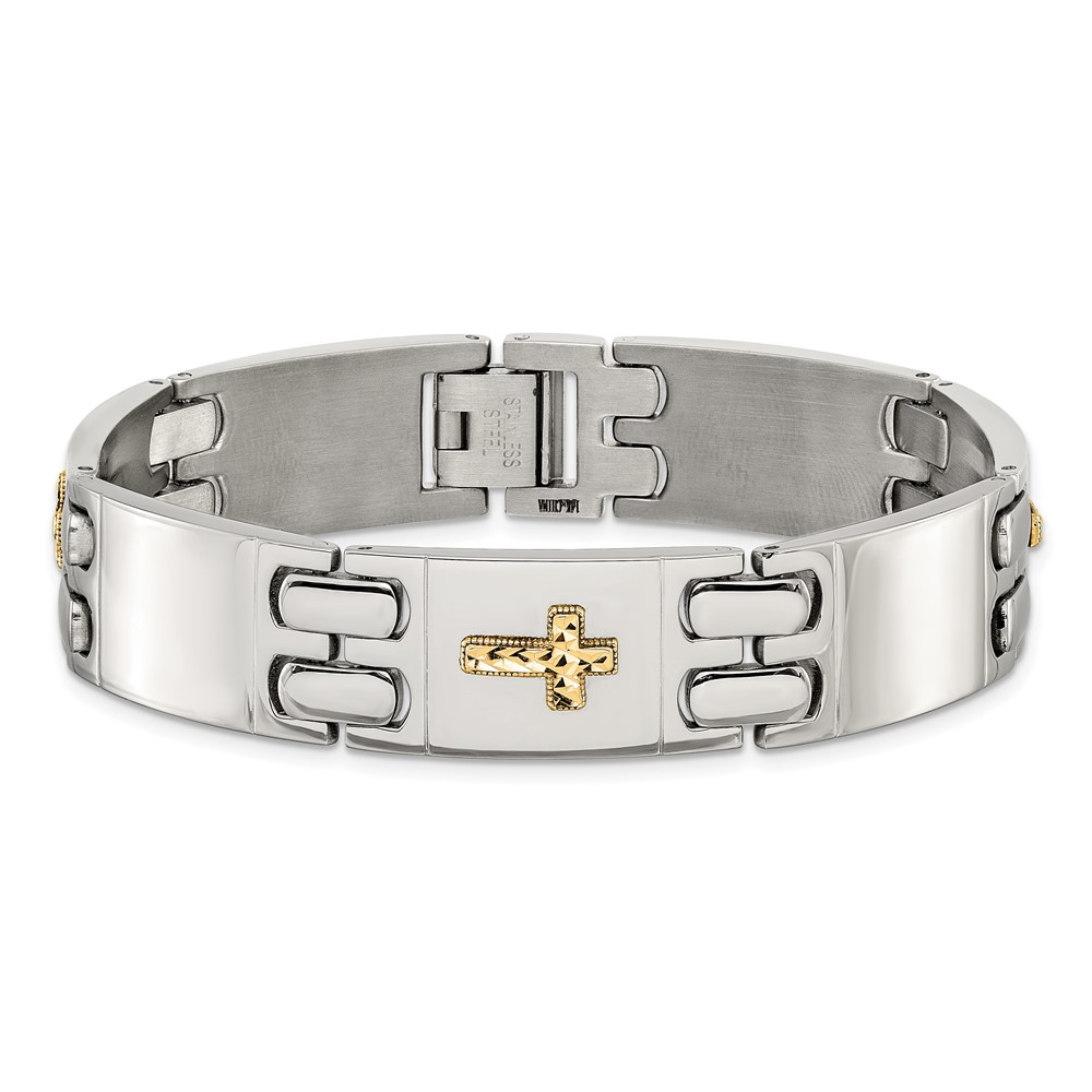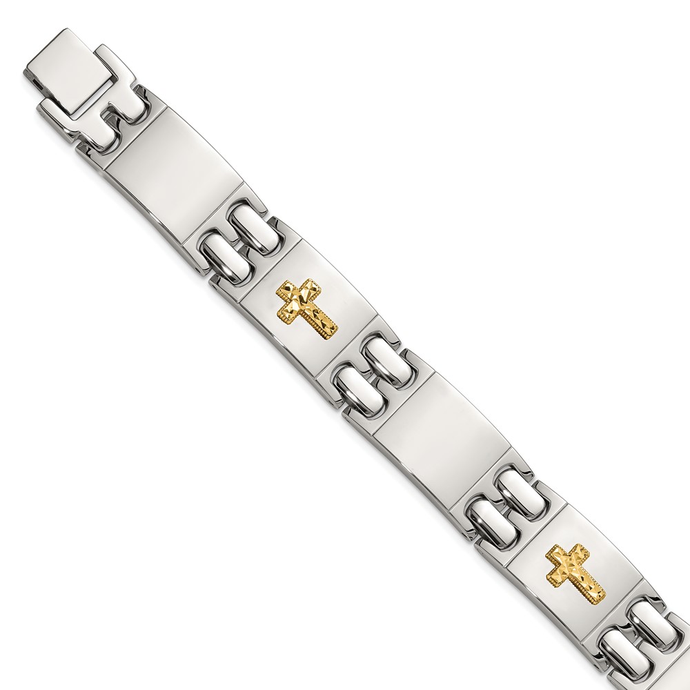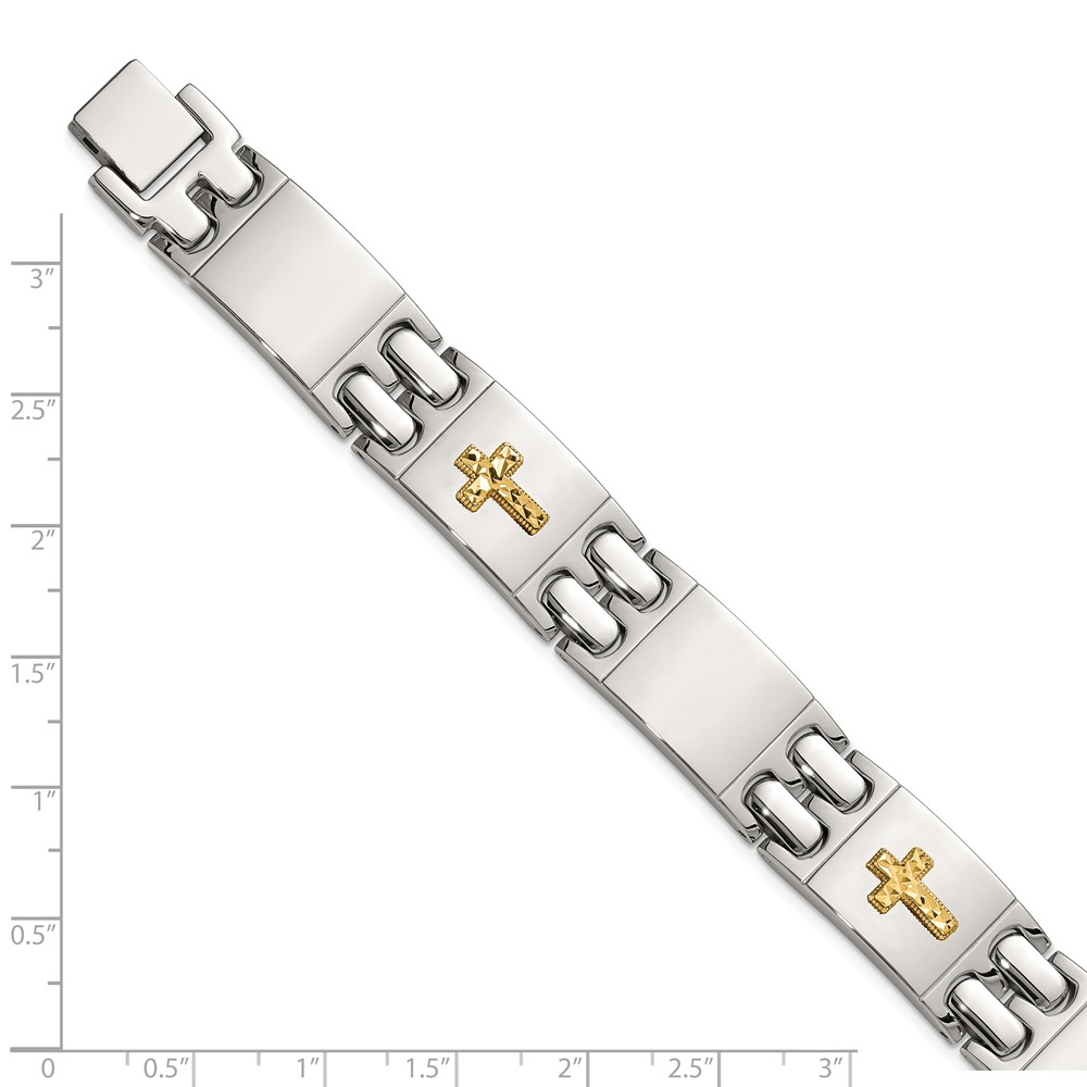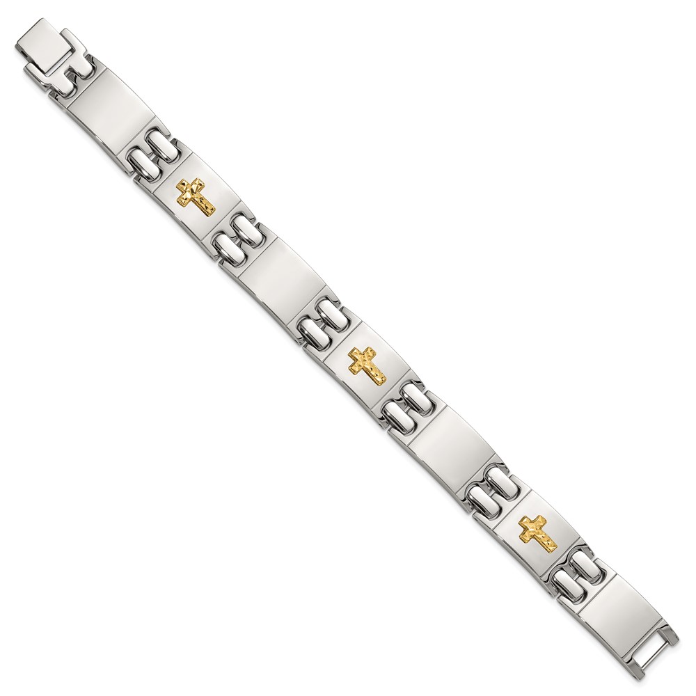 Stainless Steel Polished w/14K Accent D/C Cross 8-inch Link Bracelet