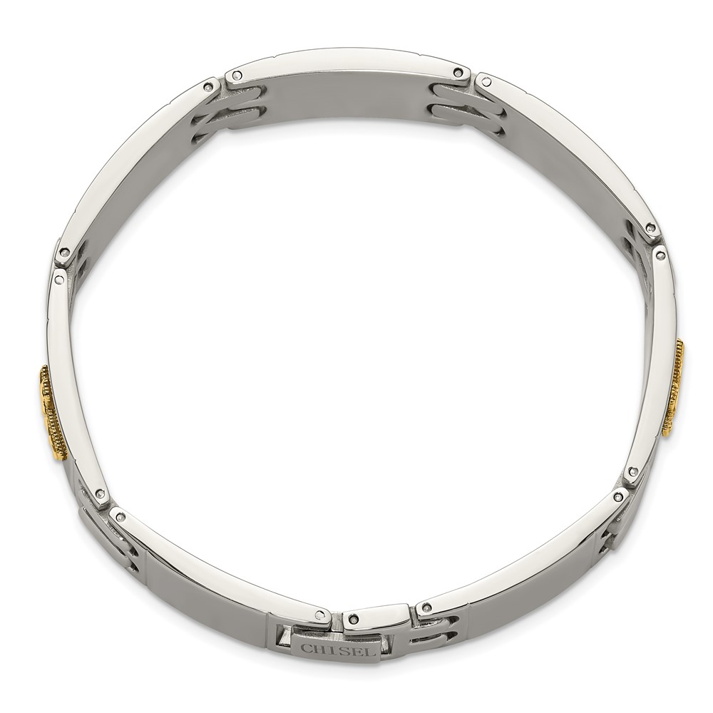 Finish:Polished Length of Item:8-inch Material: Accents:14K Gold Material: Accent Color 1:Gold Chain Length:8-inch Clasp /Connector:Fold Over Catch Material: Primary:Stainless Steel Width of Item:14 mm Packaging:Gift Boxed Product Type:Jewelry Jewelry Type:Bracelets Sold By Unit:Each Bracelet Type:Links Gender:Men’s Texture:Diamond-cut Material: Primary – Color:White