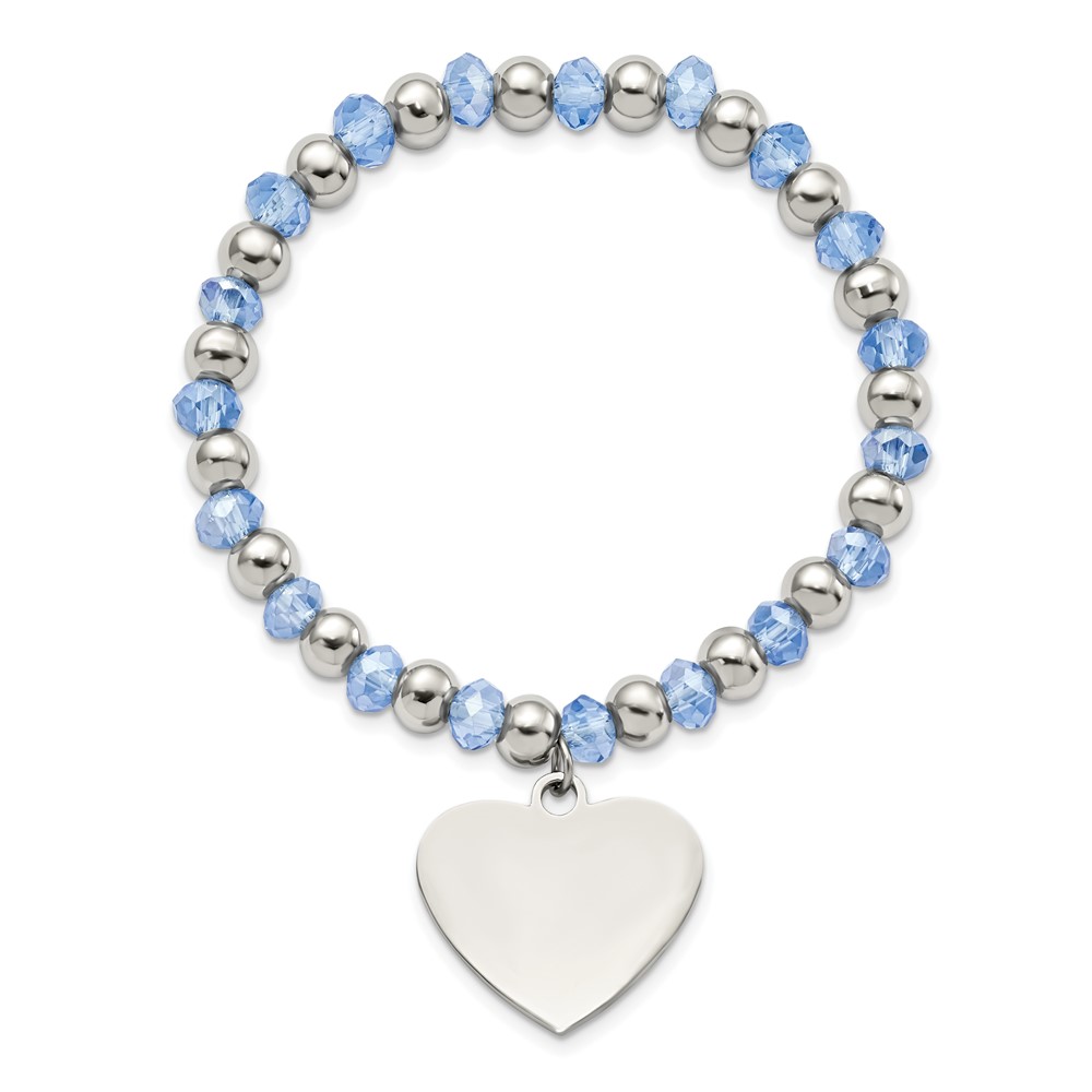 Stainless Steel Polished w/Blue Glass Beads Heart Dangle Stretch Bracelet