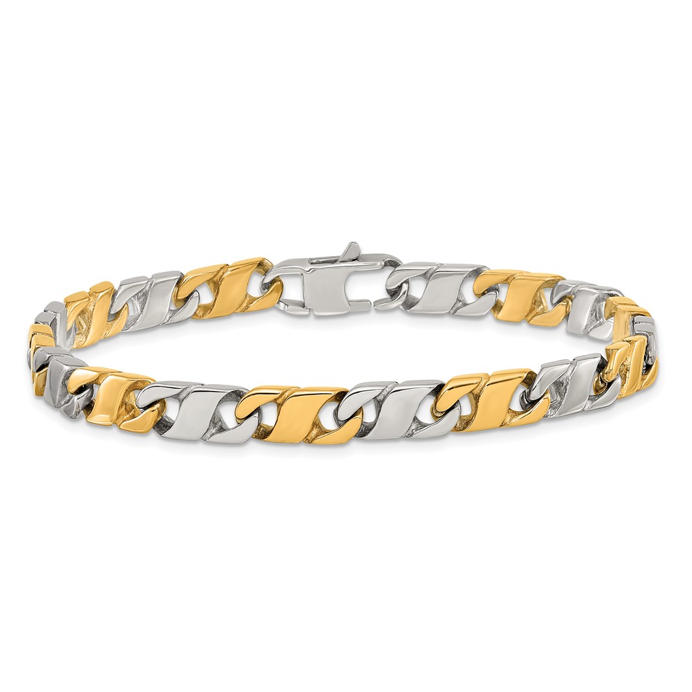 Finish:Polished Length of Item:8.5-inch Plating:IP-Plated Chain Length:8.5-inch Chain Type:Other Chains Chain Width:6 mm Clasp /Connector:Lobster Material: Primary:Stainless Steel Width of Item:6 mm Packaging:Gift Pouch Product Type:Jewelry Jewelry Type:Bracelets Sold By Unit:Each Bracelet Type:Links Gender:Men’s Material: Primary – Color:White Plating Color:Yellow