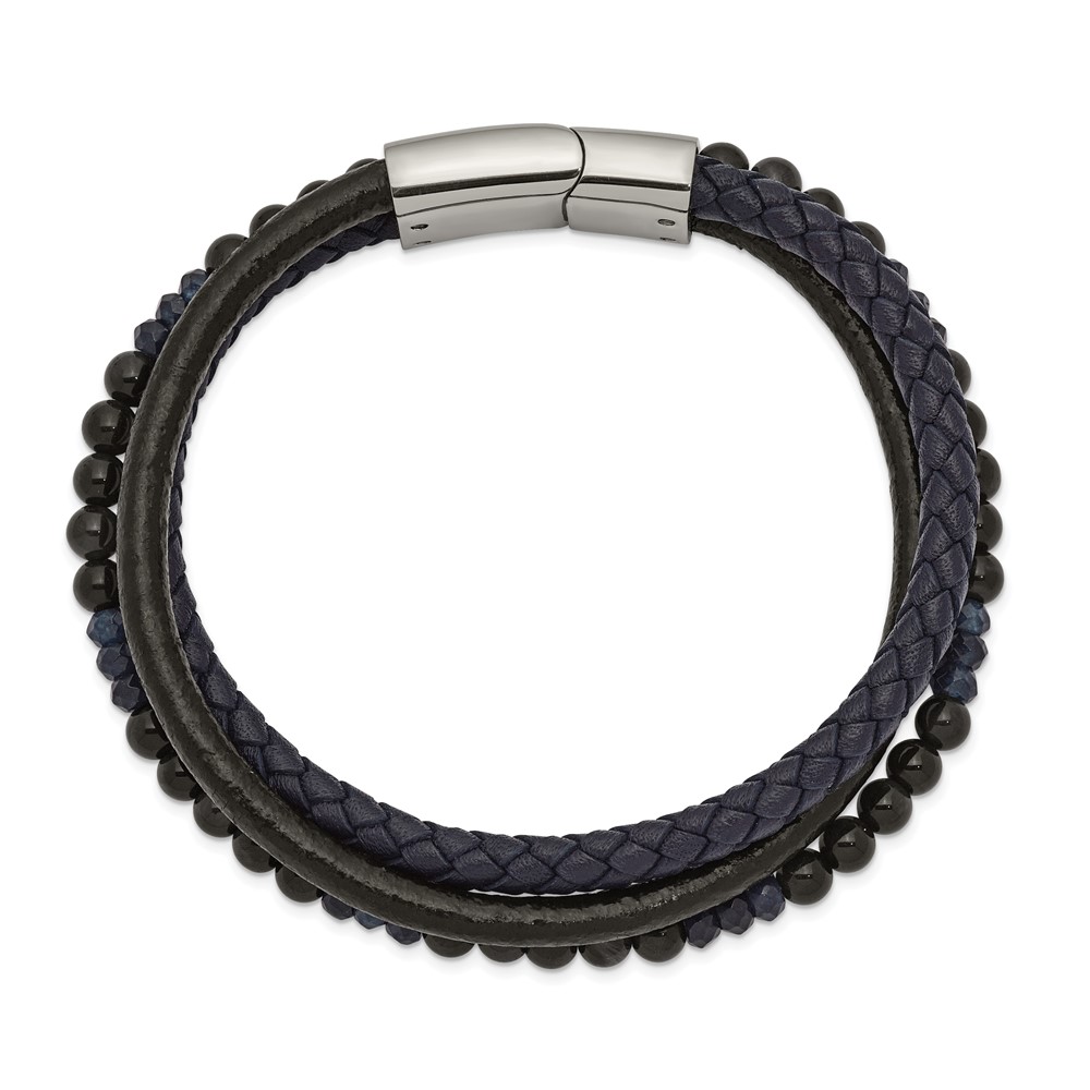 Stainless Steel Polished with Blue Chalcedony/Tiger’s Eye Leather Bracelet