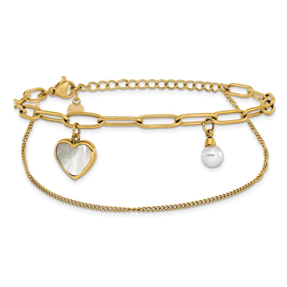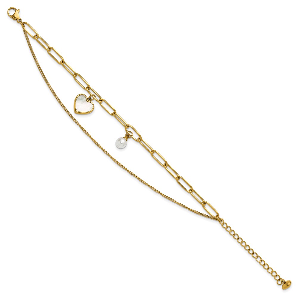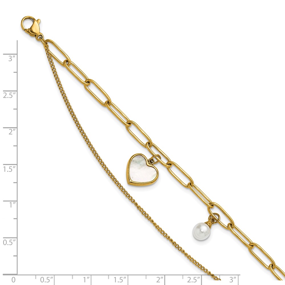 Stainless Steel Polished Yellow IP MOP/Sim. Pearl 6.5-inch +2-inch Bracelet