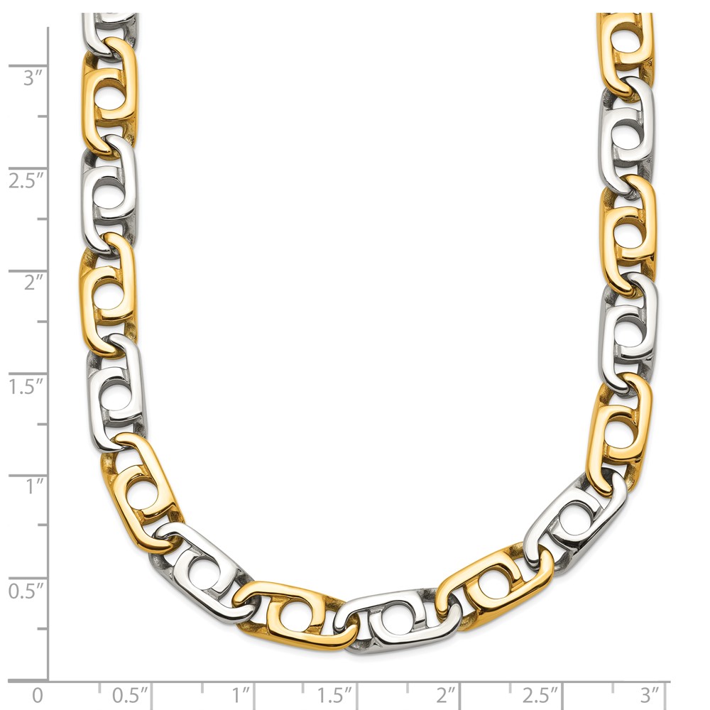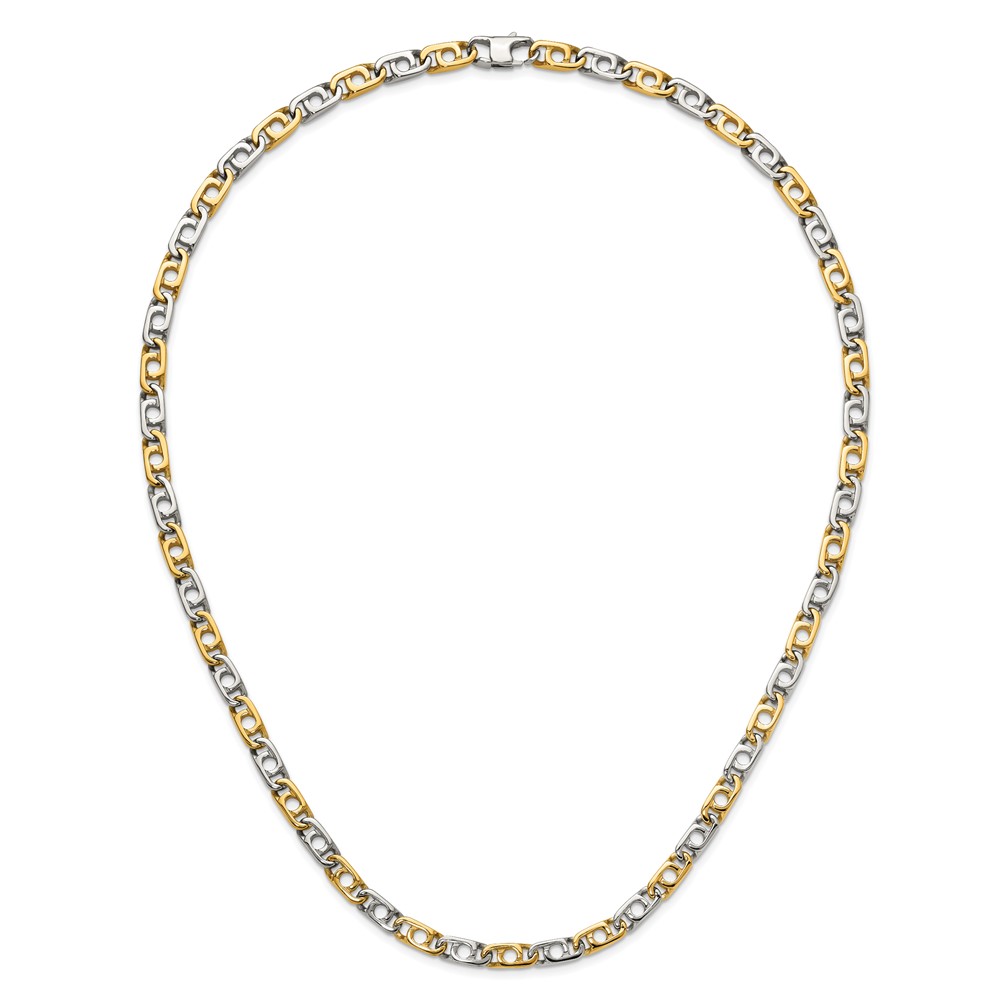 Finish:Polished Length of Item:20 in Plating:IP-Plated Chain Length:20 in Chain Type:Anchor Chain Width:6 mm Clasp /Connector:Lobster (Fancy) Material: Primary:Stainless Steel Width of Item:6 mm Packaging:Gift Pouch Product Type:Jewelry Jewelry Type:Chains Sold By Unit:Each Necklace Type:Chain Styles Gender:Men’s Material: Primary – Color:White Items per Pack:1 Plating Color:Gold Tone