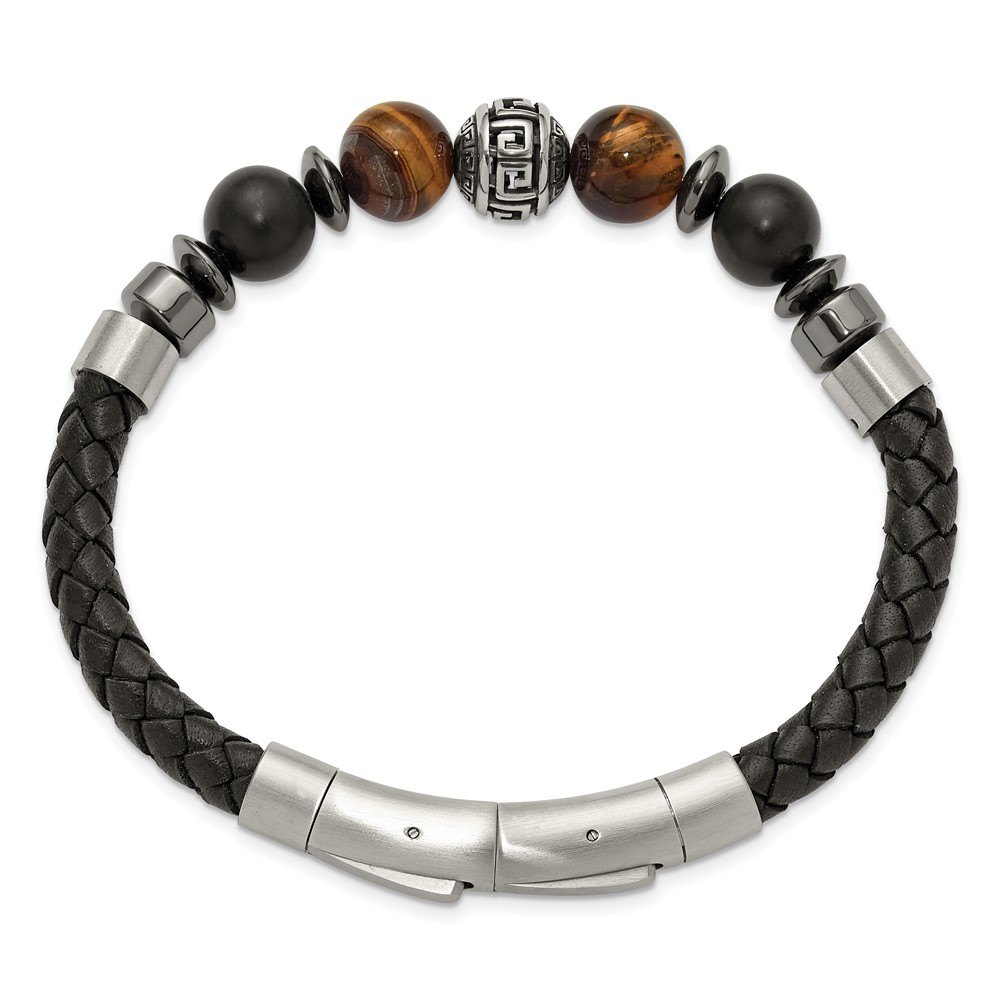 StainlessSteel Brushed/Polished Onyx/TigerEye/Hematite Lther+.5-inch Bracelet