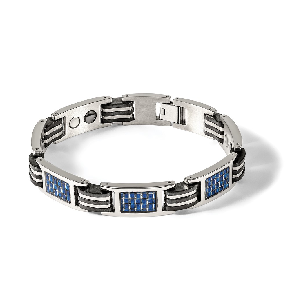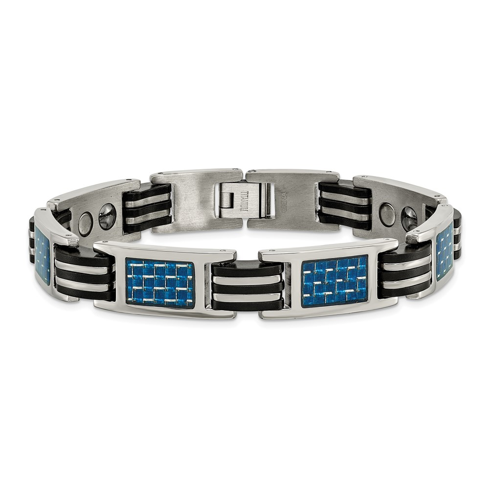 Finish:Polished Length of Item:8.5-inch Material: Accents:Rubber Material: Accent Color 1:Blue Chain Length:8.5-inch Chain Type:Link, Other Chain Width:11.5 mm Clasp /Connector:Fold Over Catch Material: Primary:Titanium Width of Item:11.5 mm Packaging:Gift Boxed Product Type:Jewelry Jewelry Type:Bracelets Sold By Unit:Each Bracelet Type:Contemporary Gender:Men’s Material:-inchlay:Carbon Fiber Material: Primary – Color:Grey Items per Pack:1 Material: Accent Color 2:Black