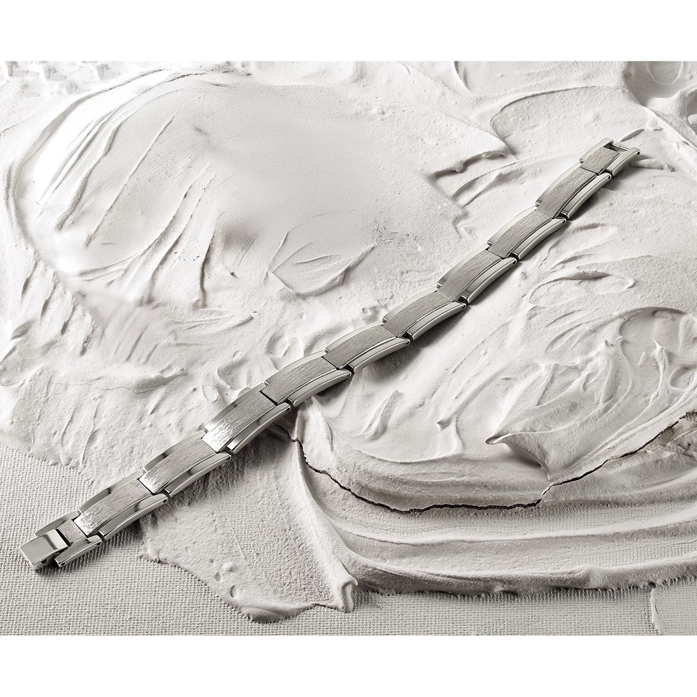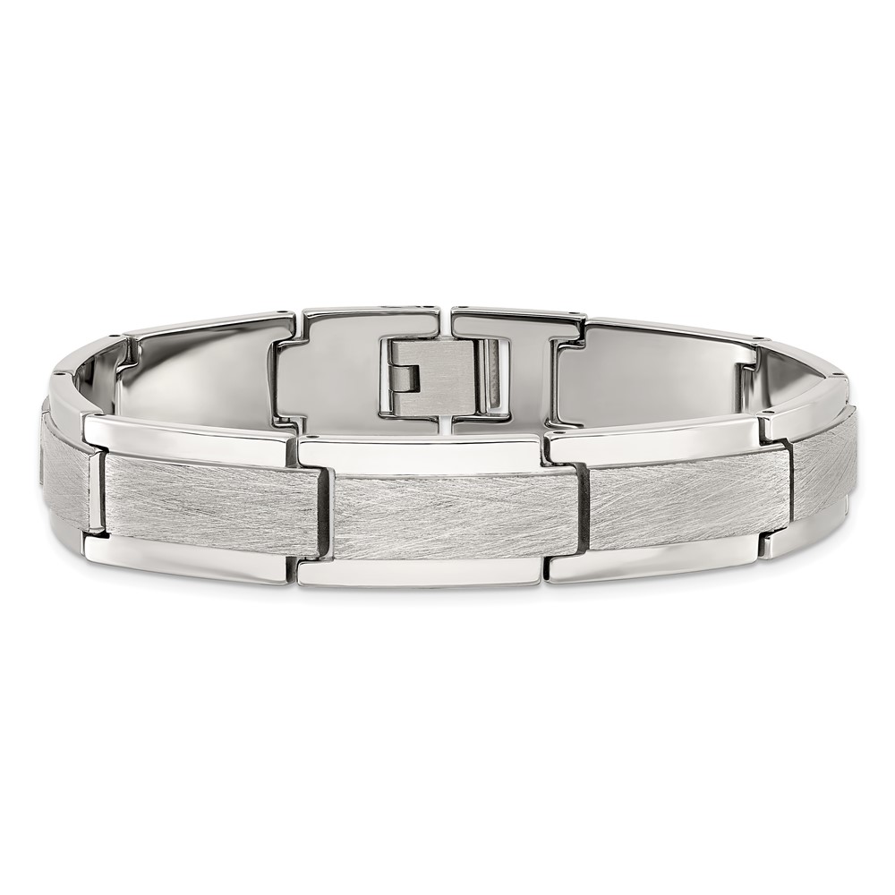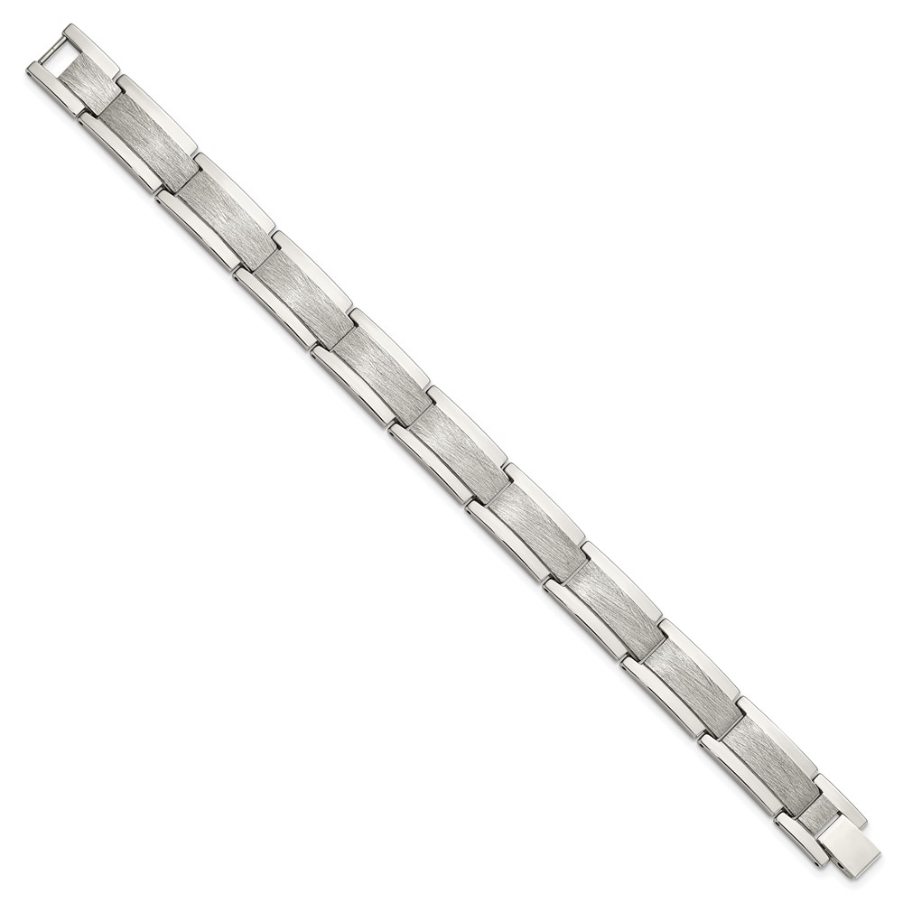 Finish:Polished & Brushed Length of Item:8.5-inch Chain Length:8.5-inch Chain Type:Link, Other Chain Width:12.5 mm Clasp /Connector:Fold Over Catch Material: Primary:Tungsten Width of Item:12.5 mm Engravable:Not Recommended Packaging:Gift Boxed Product Type:Jewelry Jewelry Type:Bracelets Sold By Unit:Each Bracelet Type:Contemporary Gender:Men’s Texture:Satin Material: Primary – Color:Grey Men’s Type:Bracelet Items per Pack:1